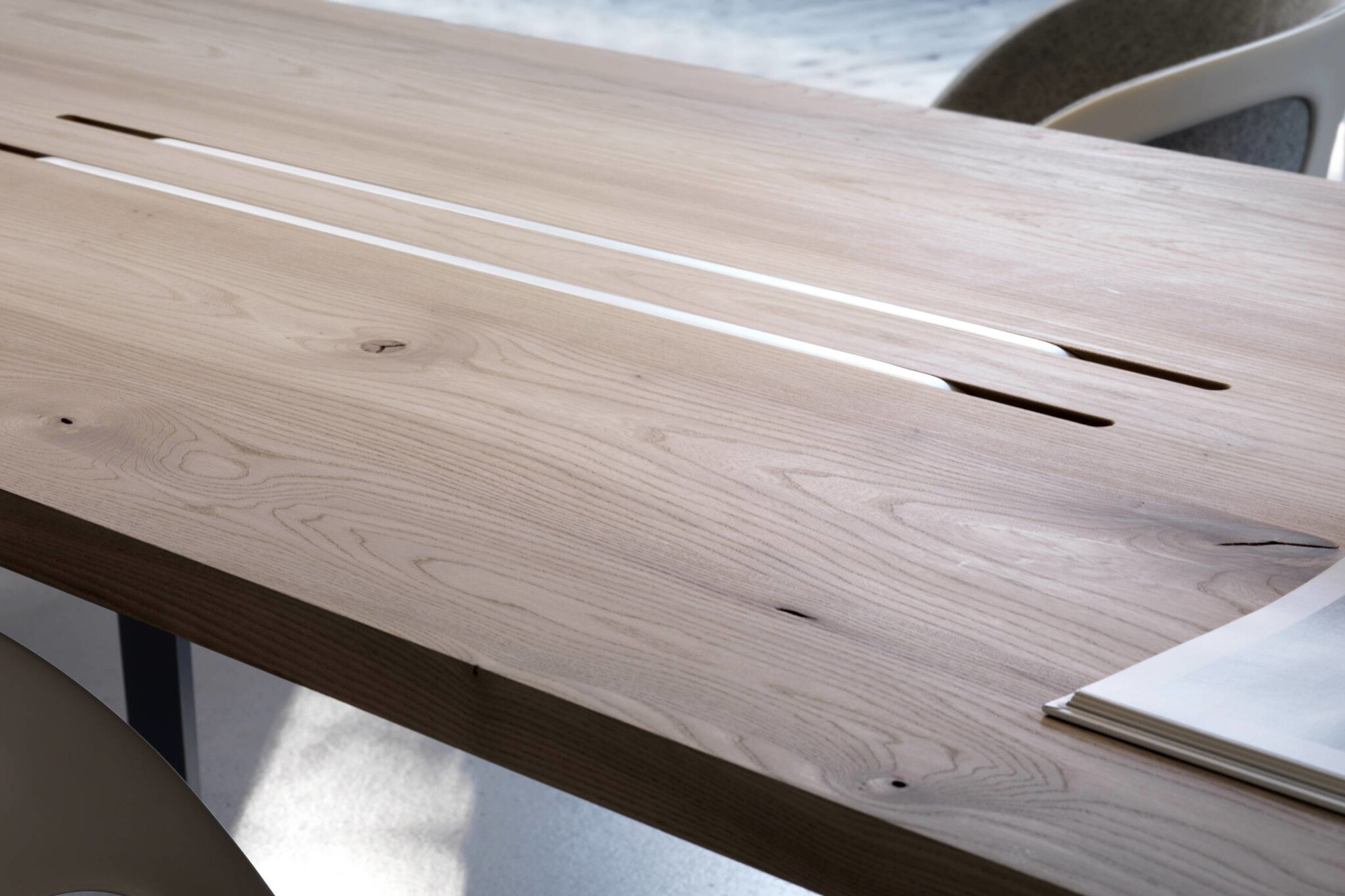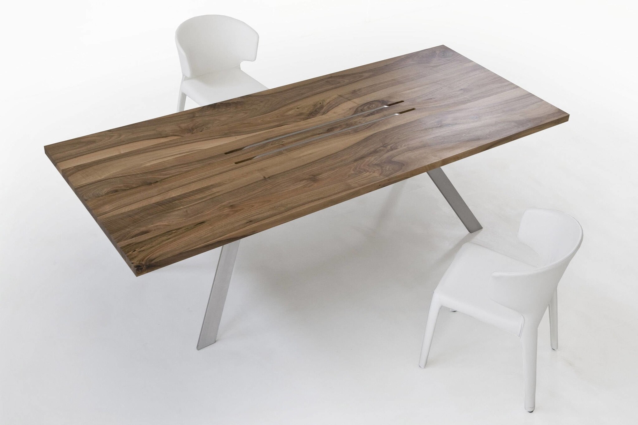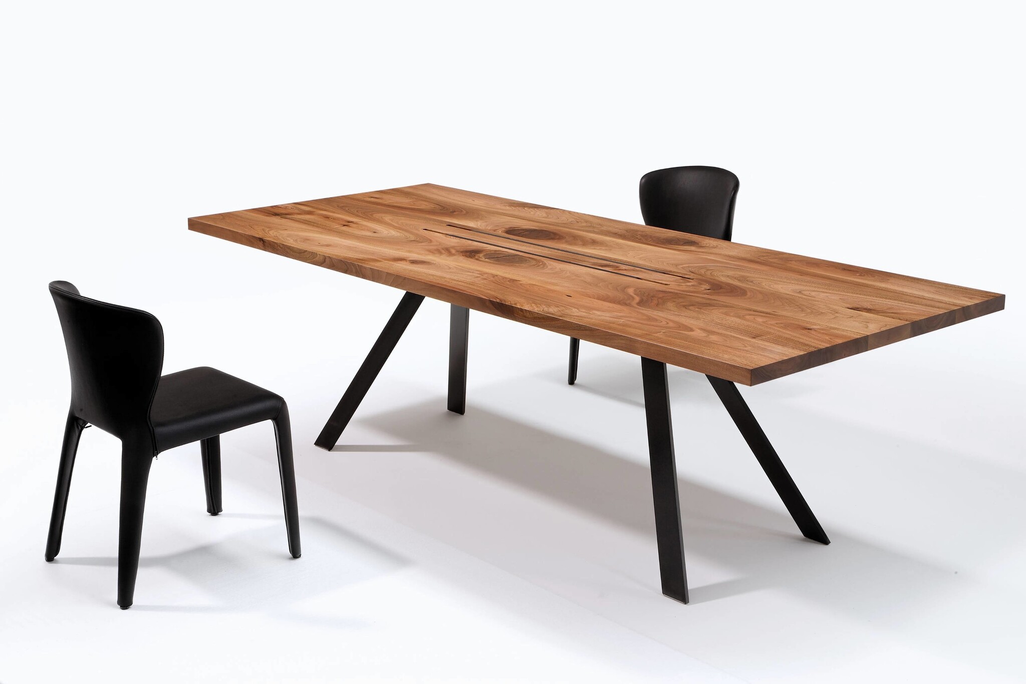 Het stoere tafelblad van Mobimex L'Arc wordt gedragen door 2 metalen bogen die als het ware versmelten met het massief houten blad. Dante Bonucelli heeft aan de vraag van Mobimex, naar een nieuw product L'Arc waar een natuurlook blad bij hoort, meer dan voldaan. Naast de 'naturart' versie met de prachtige noesten en scheuren die haar natuurlijke uitstraling behouden, wordt de tafel ook geleverd in een houtkwaliteit zonder de grovere noesten. Het onderstel van Mobimex L'Arc wordt gemaakt in mat en glanzend geborsteld chroom en gebruineerd (zwart) en geborsteld staal.