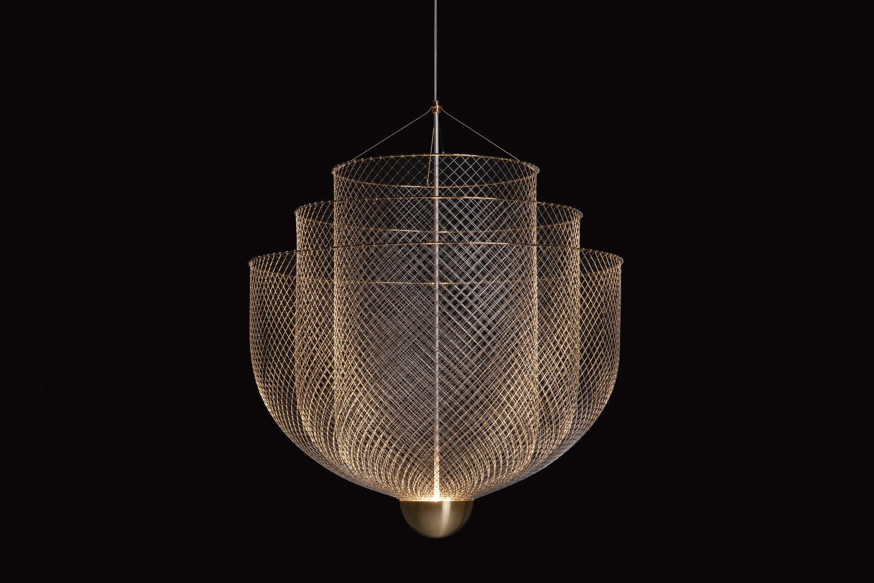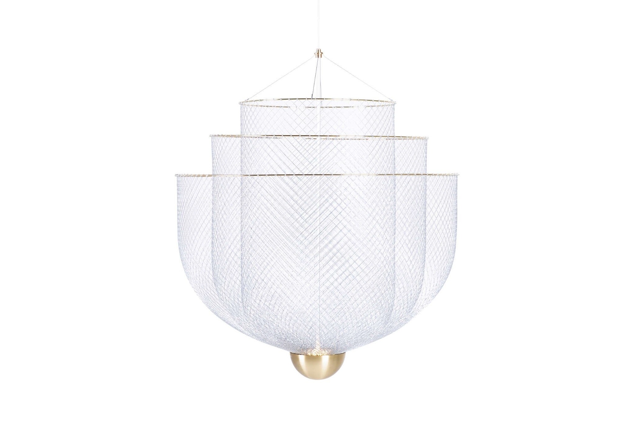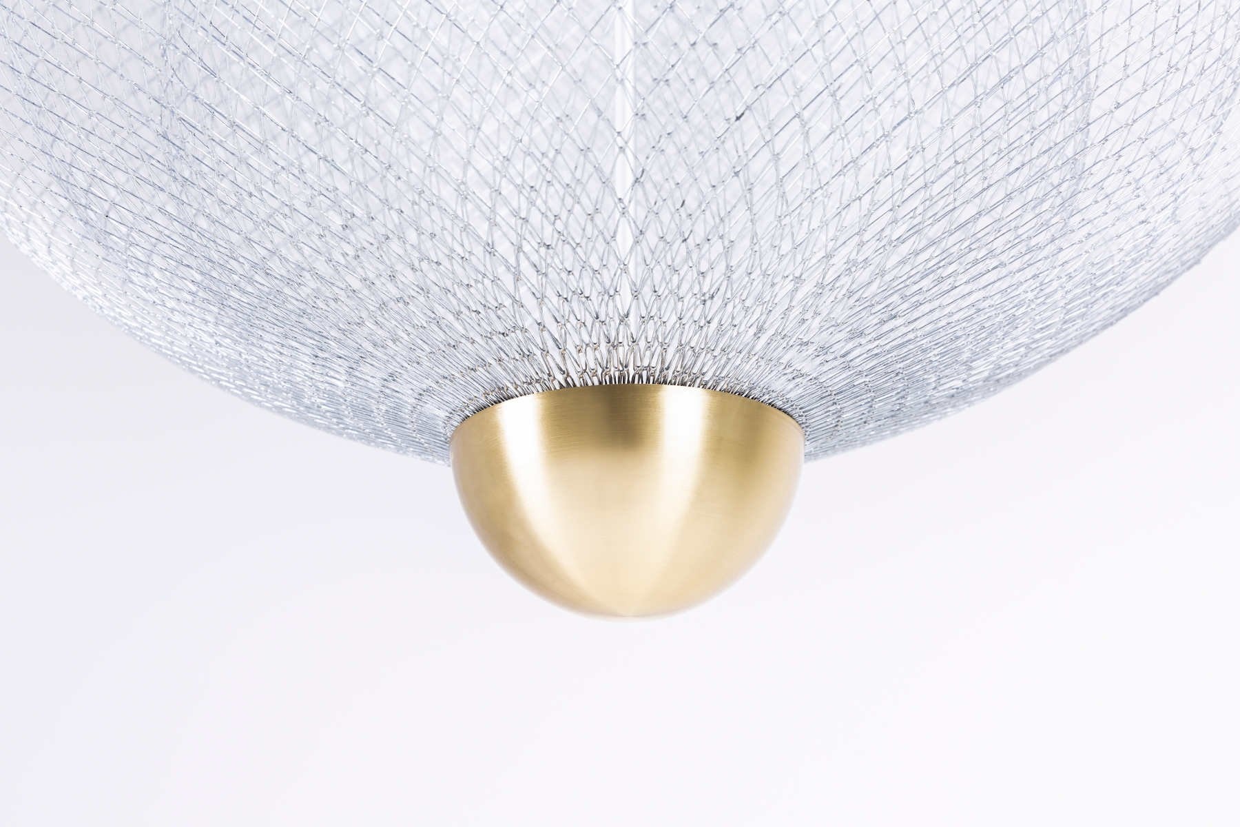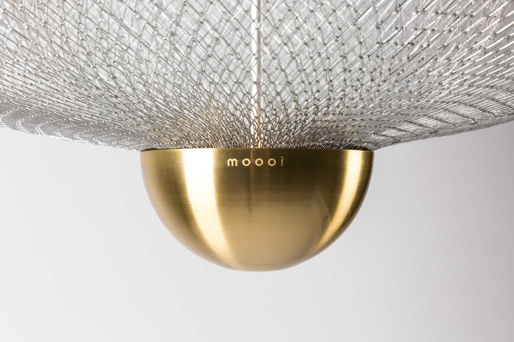 De Moooi Meshmatics hanglamp is een prachtige aanvulling op uw ruimte. Deze lamp doet haar naam danken aan de Mesh structuur die bij de lampenkap te zien is. Dit ziet er indrukwekkend uit doordat het eigenlijk als het ware drie kappen zijn: één brede kap aan de buitenzijde, daarbinnen een wat smallere, lange kap en daarbinnen nog één smalle, wat hogere kap. Aan deze laatste zijn draden gekoppeld waarmee de lamp kan worden opgehangen. Een mooi product voor in een lounge, lobby of hal. Eigenschappen van de Moooi Meshmatics hanglamp