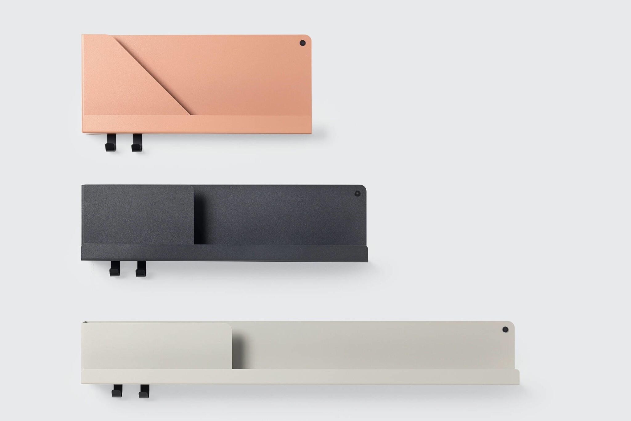 De Muuto Folded Shelves opbergsystemen zijn geïnspireerd op het spelen met schaduwen van verschillende lagen. Dit opbergsysteem is gemakt door simpelweg het bouwen van metalen platen, om zo verschillende vakken te creëren. Met zijn subtiele design kan dit ontwerp gebruikt worden als decoratie zowel als praktisch object. Muuto Folded Shelves is bruikbaar om van alles te organiseren, van boeken tot toiletartikelen tot kruiden. Gemaakt van met een laser gesneden staalplaat van 1,5 mm, de staalplaten worden gebogen en vervolgens gepoedercoat met een acryl coating. Wordt geleverd met twee bouten voor de montage.