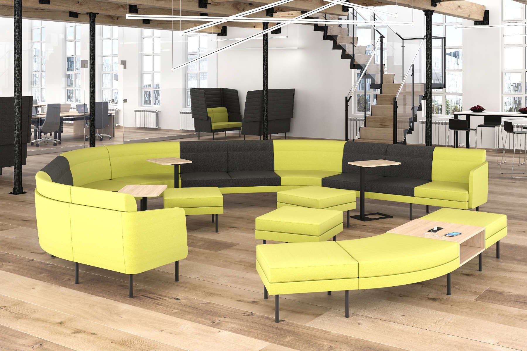 Inbouw van elektrificatie is ook mogelijk om zo de laptop of andere elektronische devices van de gebruikers op te laden.