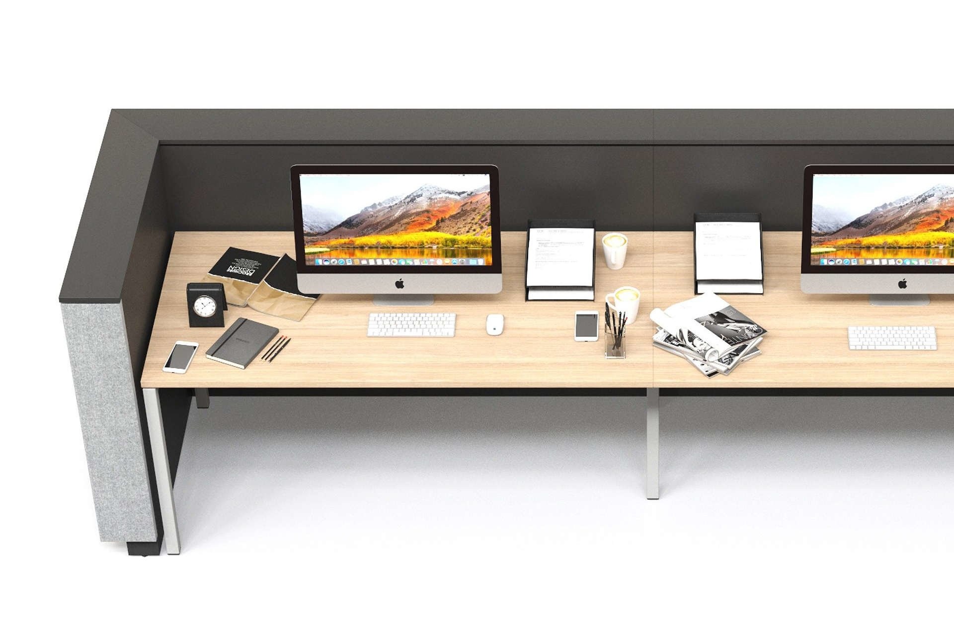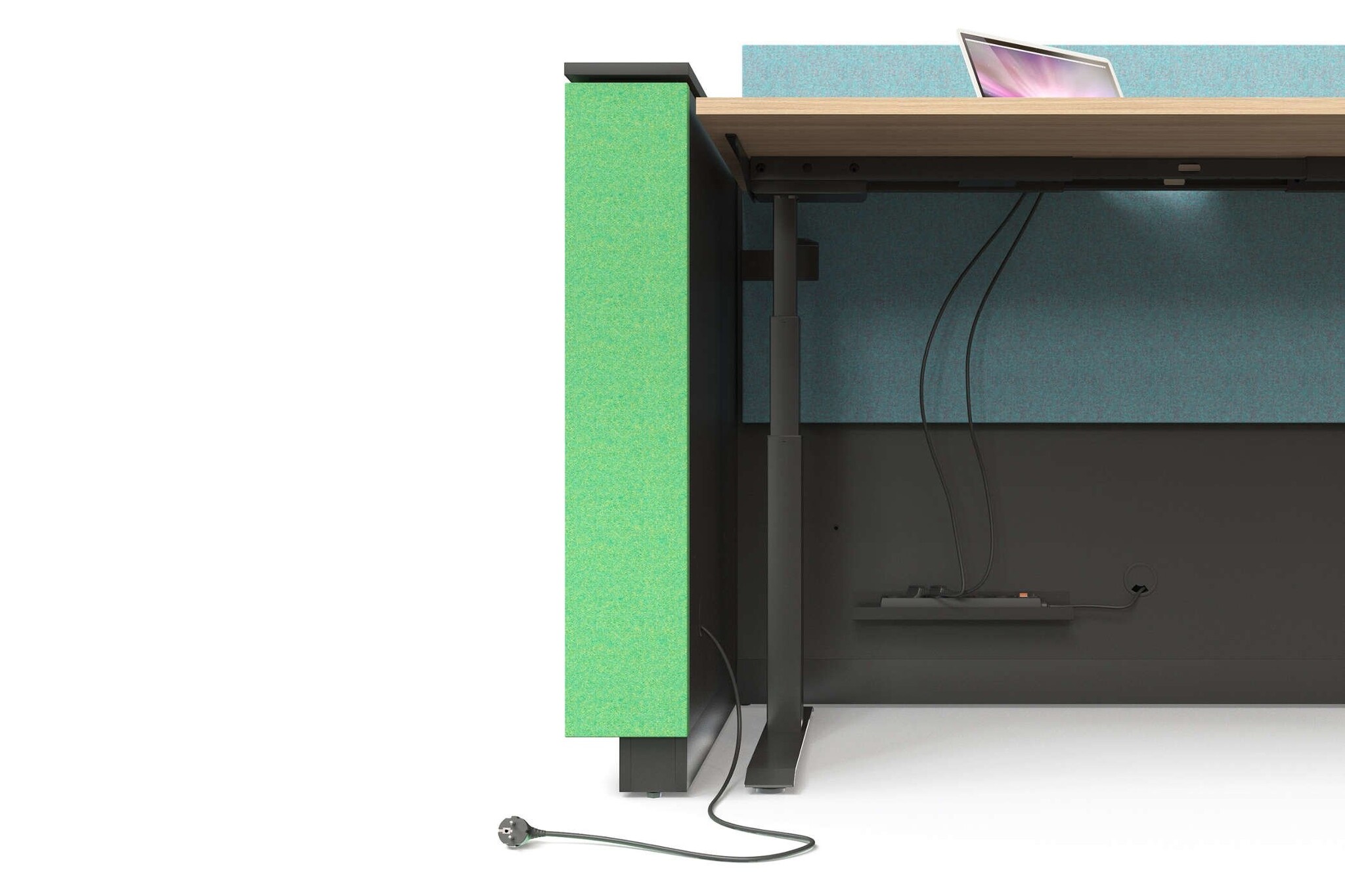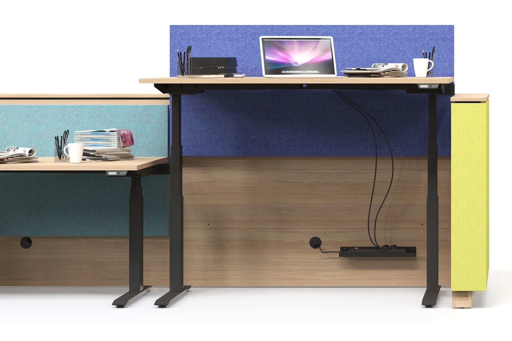De montagehoogte van deze Modus-schermen kan worden aangepast zodat ze niet zichtbaar zijn voor bezoekers wanneer het bureau in een lage stand staat, en ze schermen de ruimte onder het tafelblad af wanneer het bureau wordt verhoogd.
