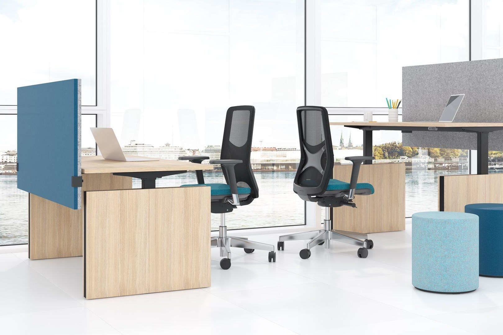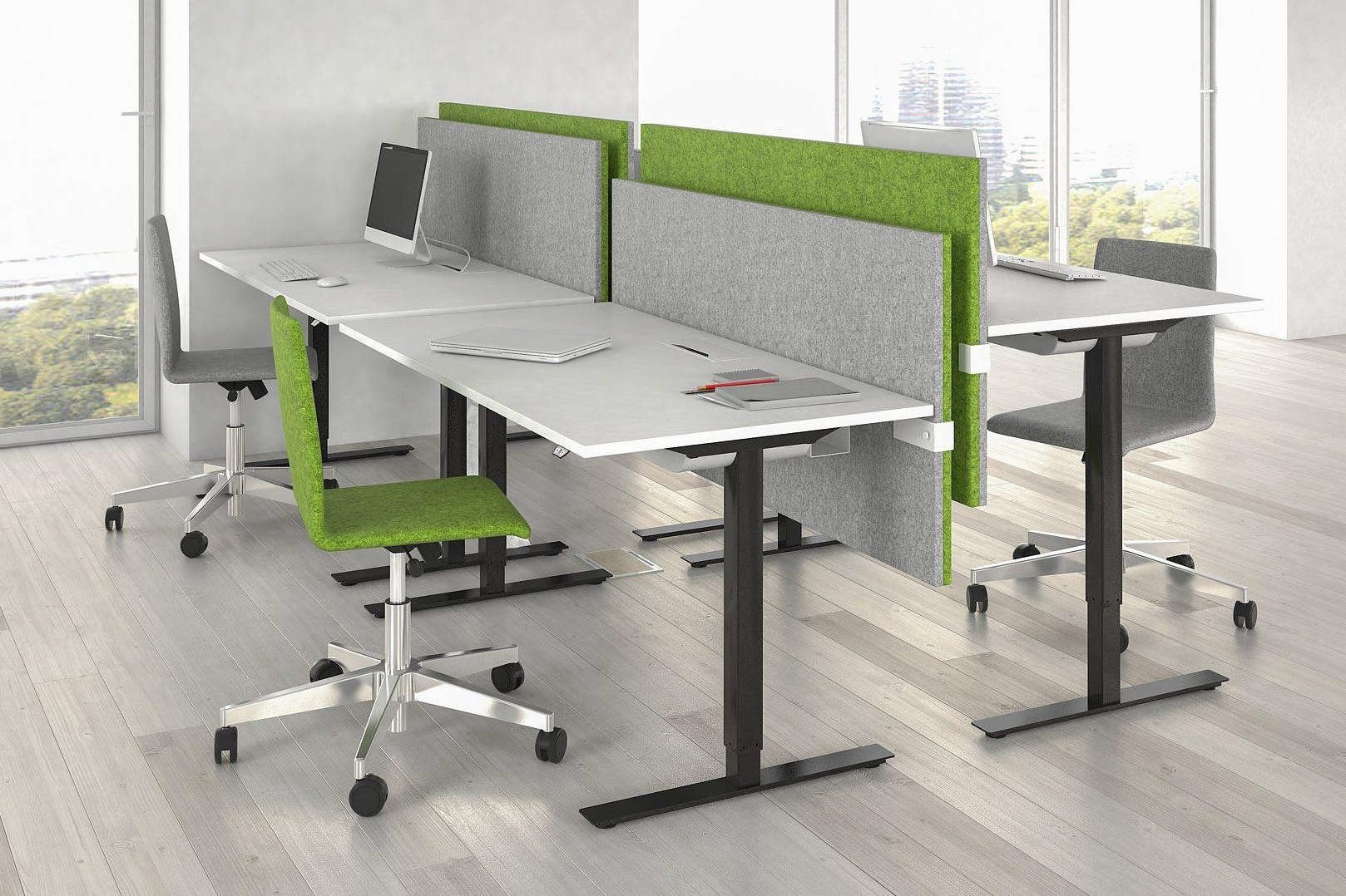 In hoogte verstelbare schermen met akoestische eigenschappen.