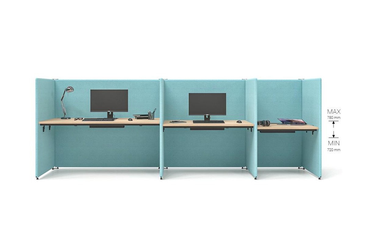 De akoestische schermen zijn verkrijgbaar in 5 verschillende breedtes (800 mm, 1000 mm, 1200 mm, 1400 mm, 1600 mm) en 2 verschillende hoogtes (1320 mm, 1620 mm).