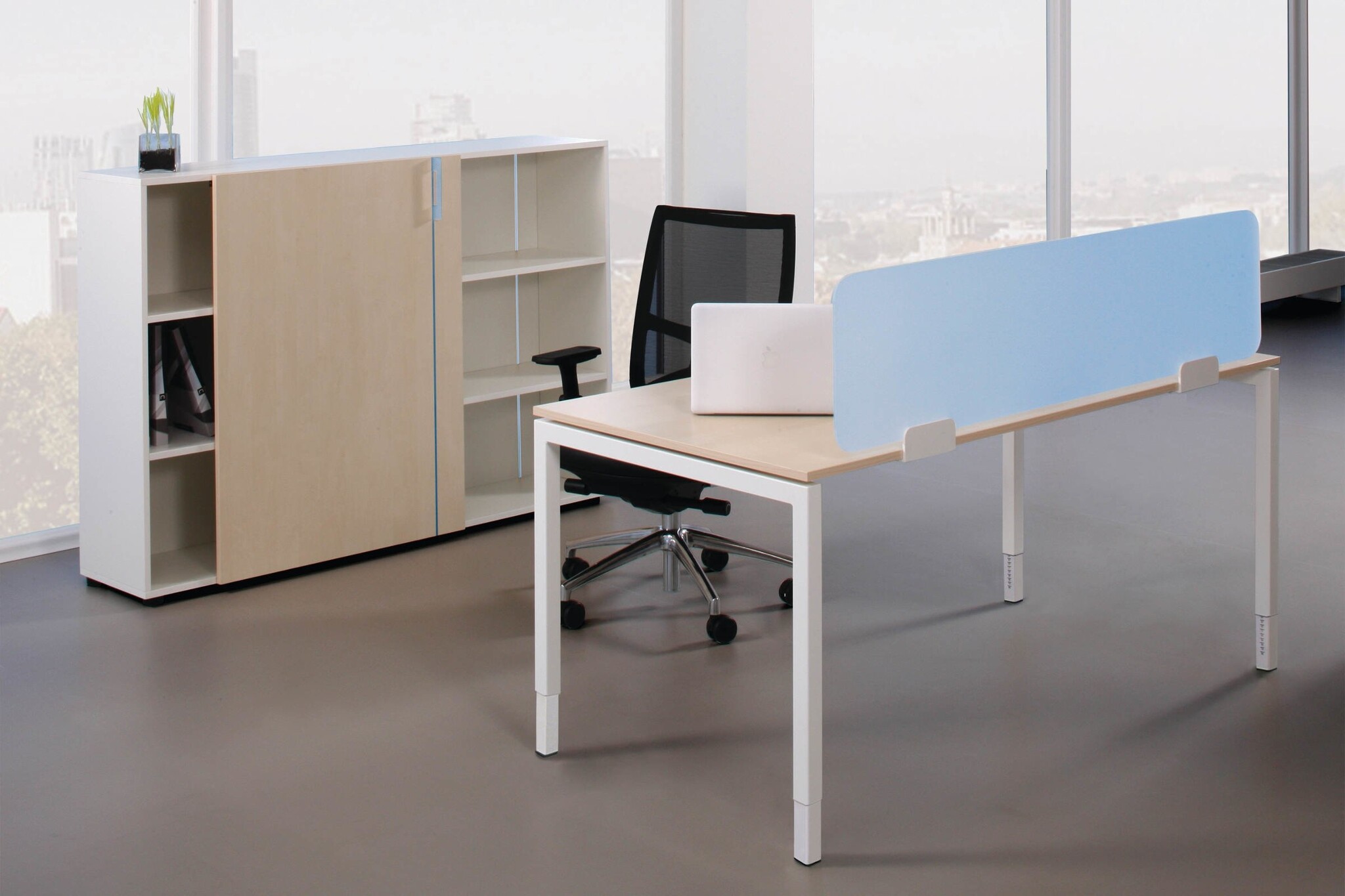 Het melamine blad is leverbaar in wit, gebleekt eikenprint of berkenprint (standaard). Het blad kan ook in MDF zwarte desktop (marmoleum).
