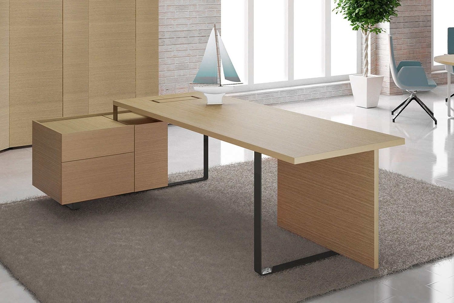 Narbutas Plana is een directiebureau waarbij verschillende opstellingen mogelijk zijn. Zo heeft u een werkplek waarbij aan de linker of rechterkant ladeblokken geplaatst kunnen worden. Deze ladeblokken zijn poot vervangend en ideaal om uw persoonlijke eigendommen in op te bergen. Het elegante onderstel van dit directiebureau geeft een strakke maar ook klassieke uitstraling. Door de keuze in verschillende houtkleuren van het werkblad en ladeblokken kunt u uw eigen stijl creëren die bij u en de huisstijl van uw bedrijf past. De tafelbladen zijn voorzien van een mooi afgewerkt klepje waar een stekkerdoos in geplaatst kan worden om zo direct toegang te hebben tot stroompunten om uw apparaten, zoals laptop of telefoon, op te kunnen laden.