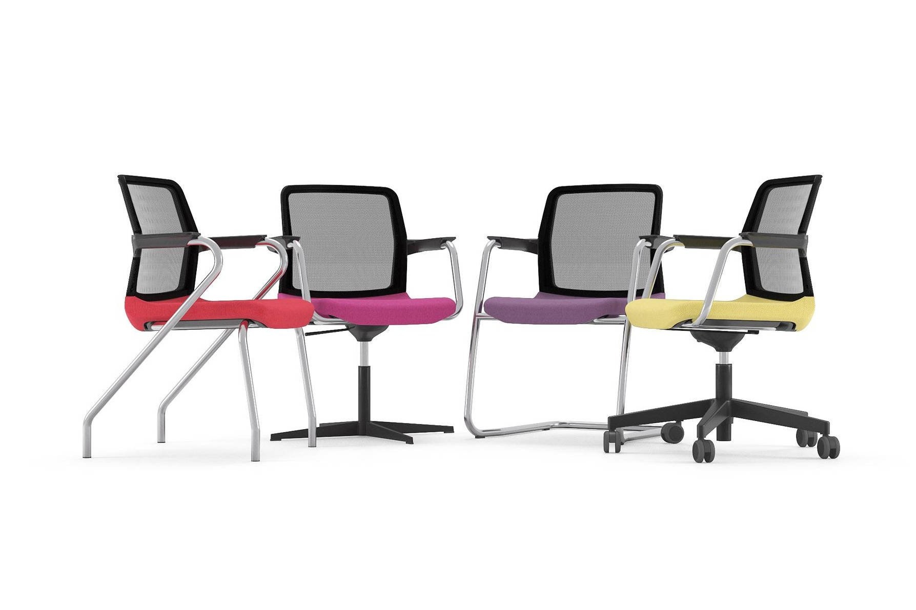 Deze stoelen zijn verkrijgbaar in vier verschillende basisopties: sledestoel met buisframe, vierpootstoel, stervoet en kruisvoet op wielen.