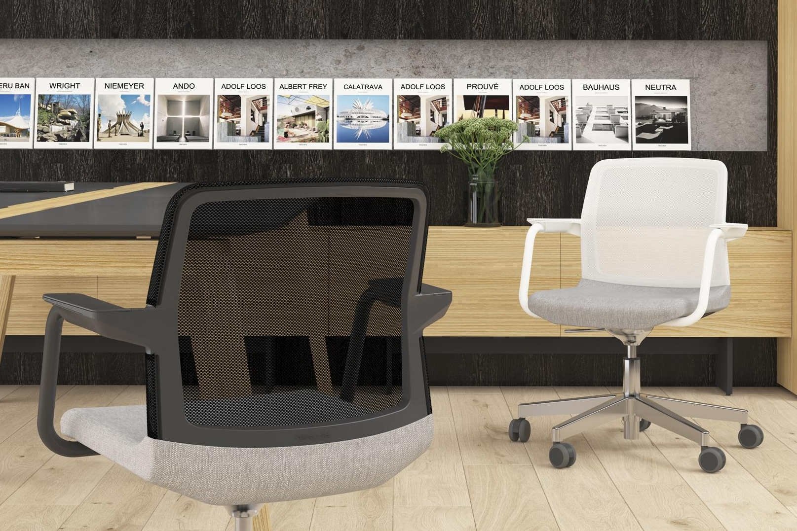 De rugleuning van de stoel volgt dezelfde lijnen en ontwerpprincipes van de bureaustoel en bezit tegelijkertijd enkele unieke kenmerken.