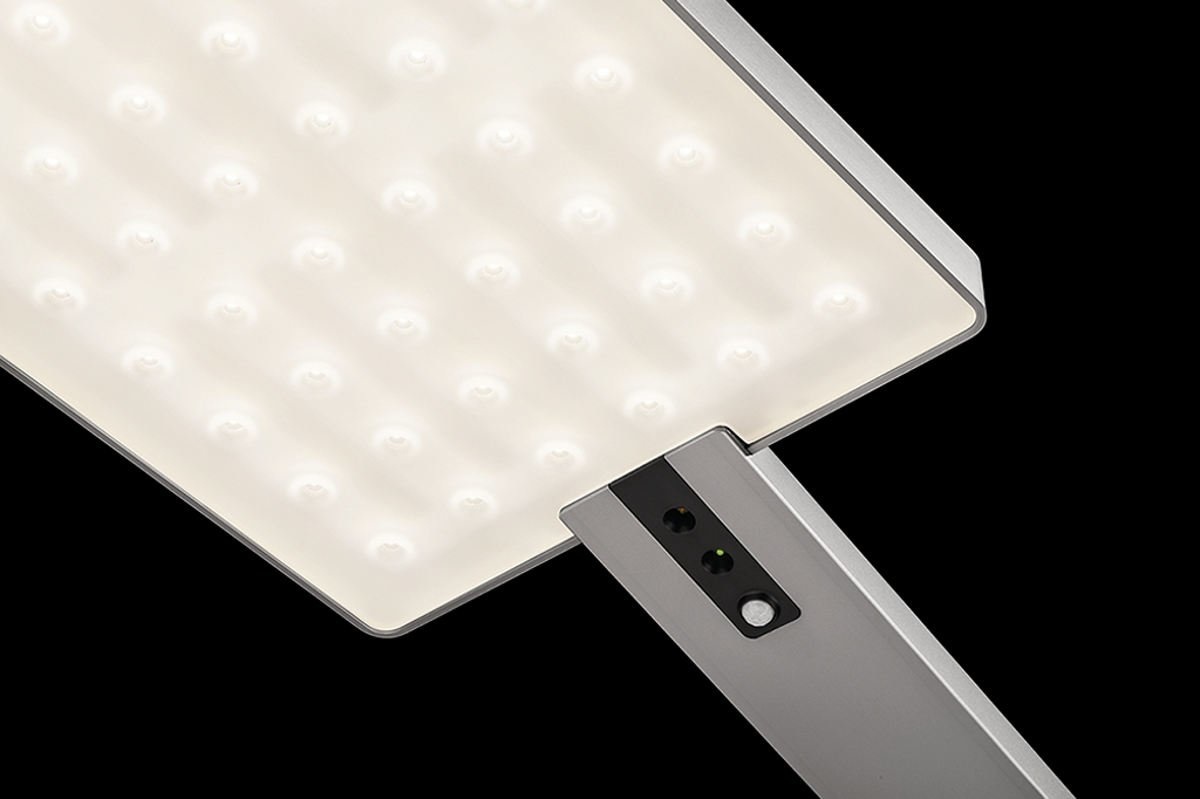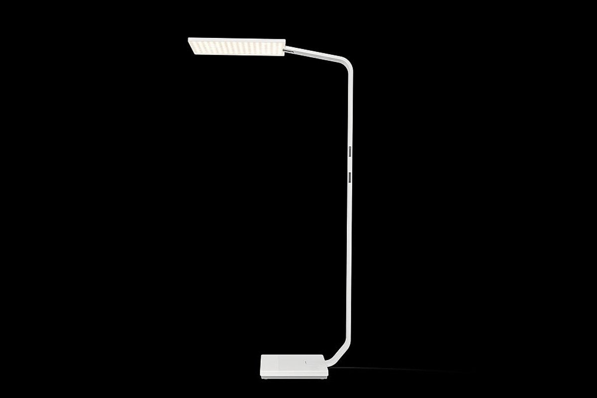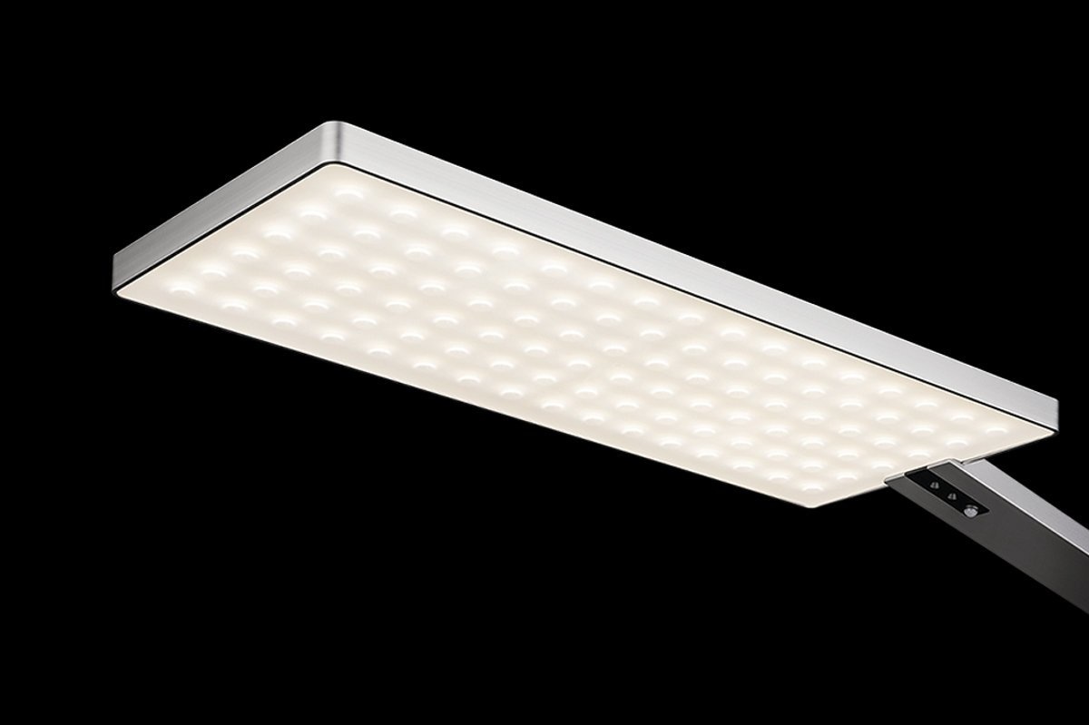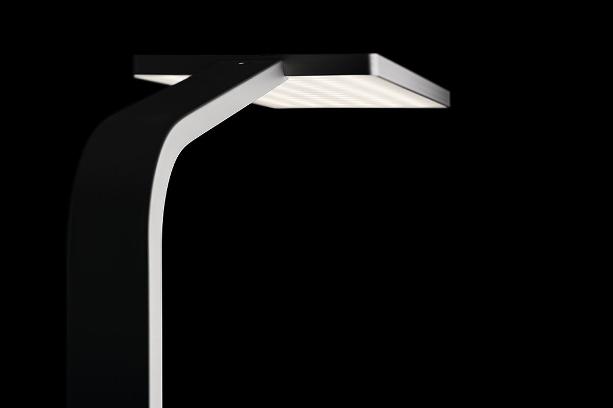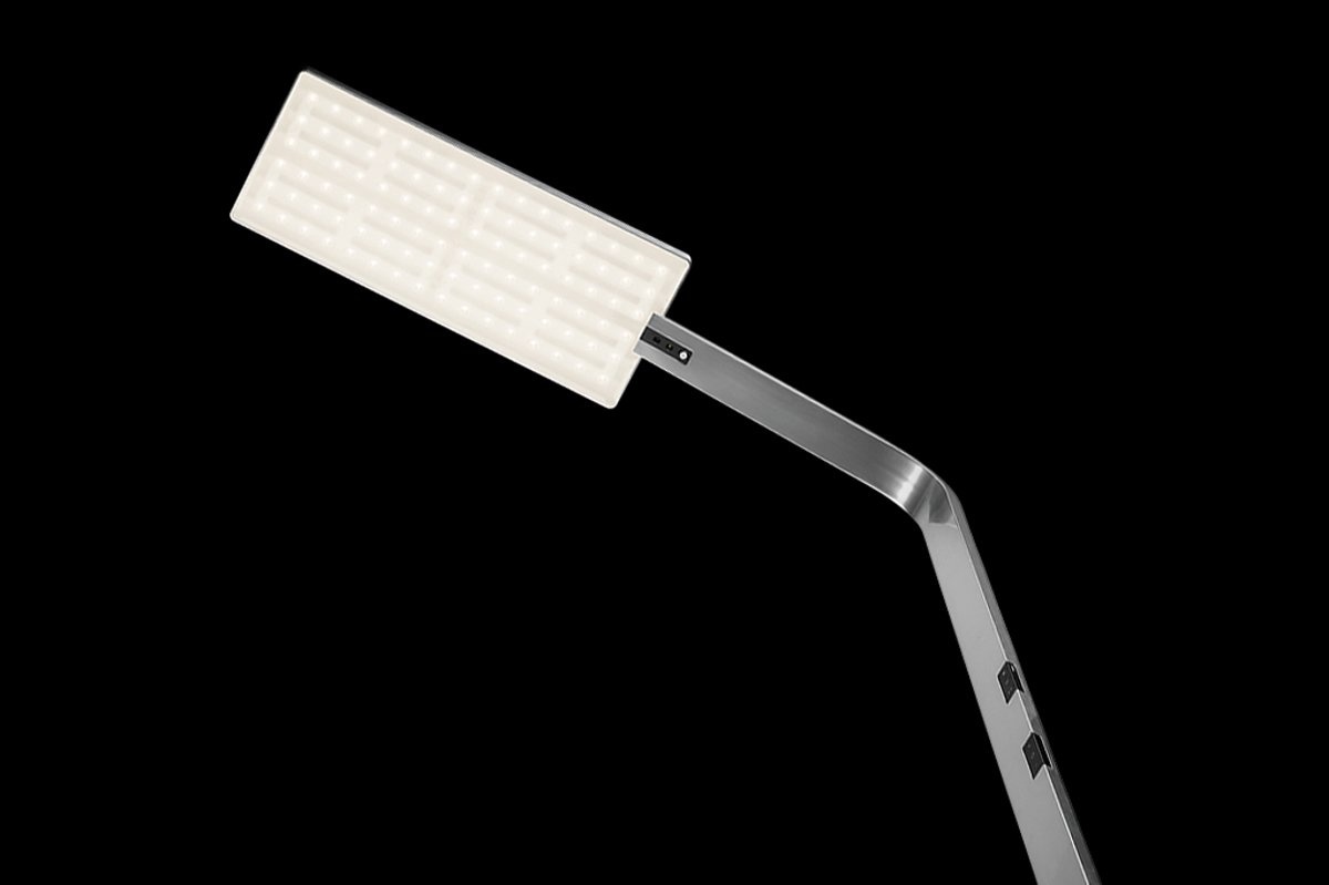 De Nimbus Force One lamp heeft een extreem dunne kop, maar 20 millimeter dik. Het resultaat is een uniform, groot oppervlakverlichting om in te werken. Dankzij de doordachte details en het slanke silhouet heeft de Force One elegantie. De naam is net zo opvallend als zijn vorm: Force One. Als je het voor de eerste keer ziet en gebruikt, ziet alles er zorgvuldig uit. Elk detail heeft zijn eigen logica en zijn elegante en duidelijke contouren genereren een indruk van de algehele samenhang. De cruciale innovaties van de Force One zijn misschien helemaal niet duidelijk op het eerste gezicht, maar worden duidelijk in het dagelijks gebruik. Het hoofd van de lamp steekt ongewoon ver uit over het werkoppervlak en de voet verdwijnt bijna volledig onder het bureau. Om dit te bereiken, heeft de ontwerper Rupert Kopp de technische eenheden in de basis geïntegreerd, hoewel deze zich meestal in de kop van de armaturen bevinden. Dit maakte het mogelijk om een extreem dunne kop van slechts 20 millimeter dik te maken. Het resultaat is een uniforme, grootschalige verlichting van het werkgebied.Kenmerken Nimbus Force One staande lamp