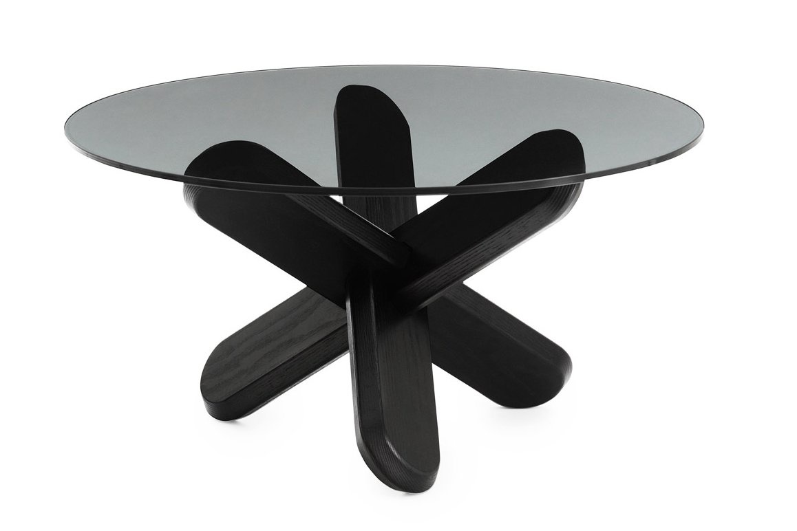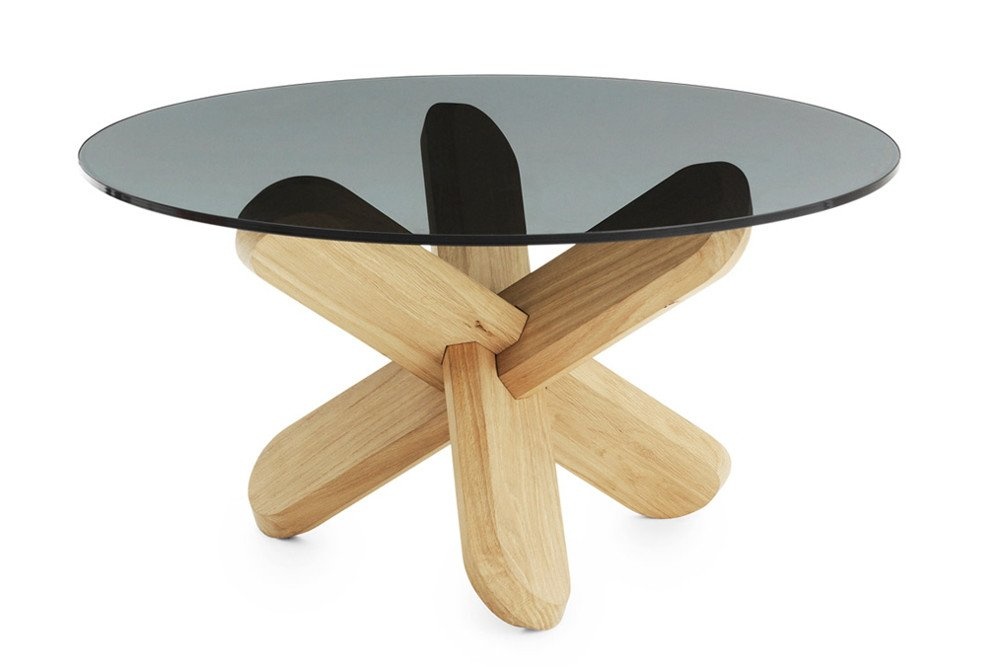 De Ding Table heeft een transparante of donkere glazen tafelblad en een eiken onderstel. De onderstellen zijn beschikbaar in de kleuren: eikenhout, koraal oranje en zwart.