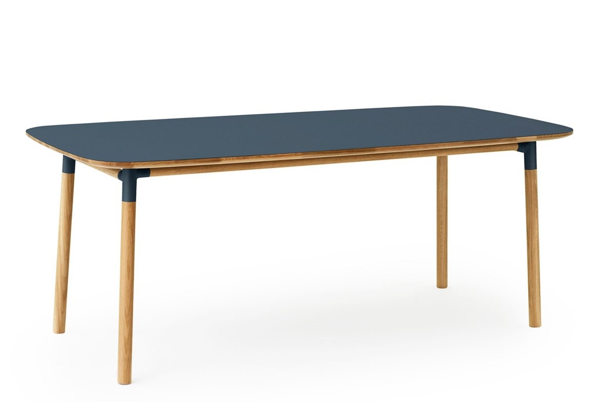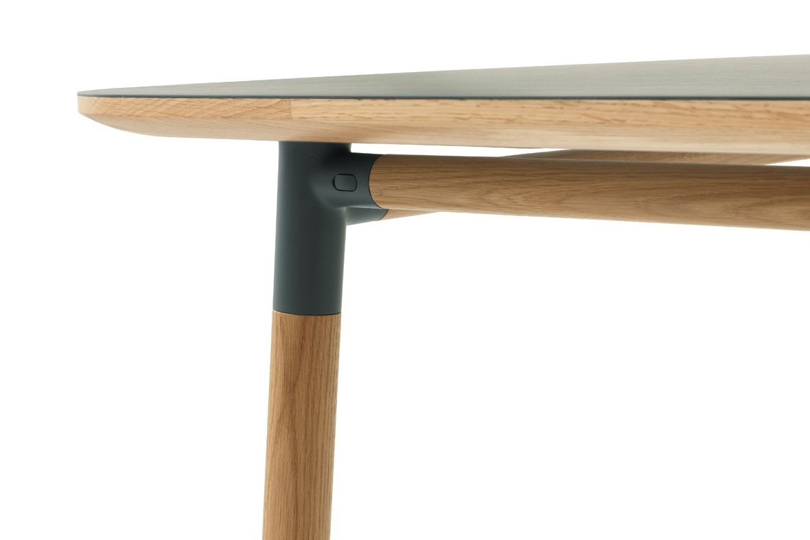 Deze Form Table tafels van Normann Copenhagen zijn verkrijgbaar in de kleuren wit, grijs, zwart, blauw, groen en rood. De poten zijn gemaakt van eikenhout en het tafelblad is van linoleum.
