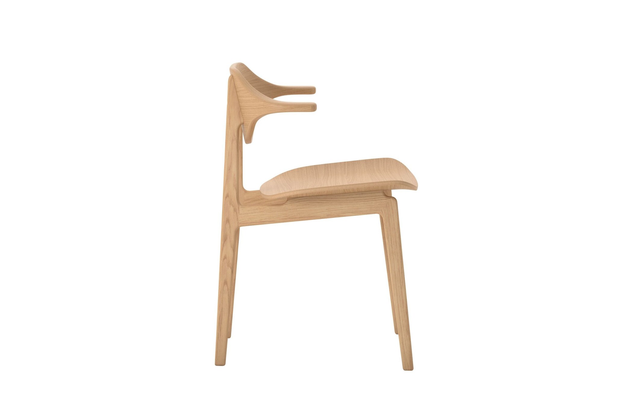 Er zijn verschillende stofferingen voor deze stoel beschikbaar, waaronder leer en eikenfineer.