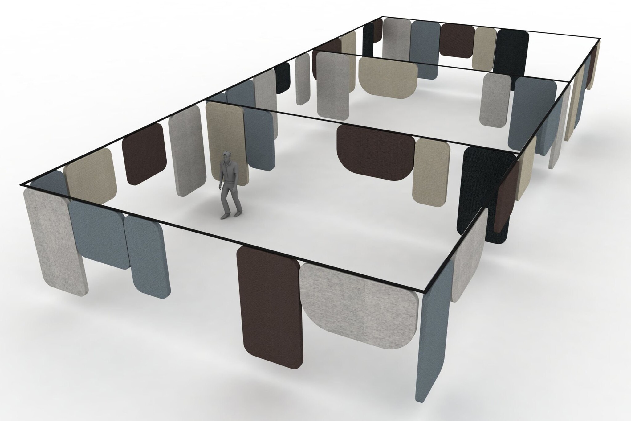 De Offecct Notes akoestische panelen absorberen niet alleen geluid, maar dienen tevens als een fraaie ruimteverdeler. Doordat de panelen aan een railsysteem aan het plafond bevestigd zijn, kan er creatief met de rangschikking omgesprongen worden. In de open ruimtes in kantoren is geluidsoverlast een groot probleem. Met akoestische oplossingen, zoals kasten, banken maar ook akoestische panelen, zoals deze Offecct Notes wordt het geluid gereduceerd, doordat het geluid geabsorbeerd wordt door de panelen. Het voordeel van de Offecct Notes is, is dat ze makkelijk ana het plafond te bevestigen zijn.