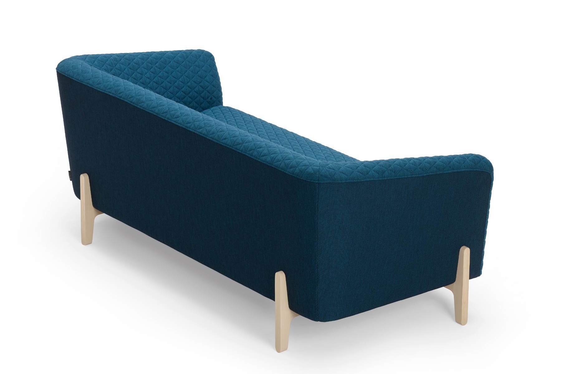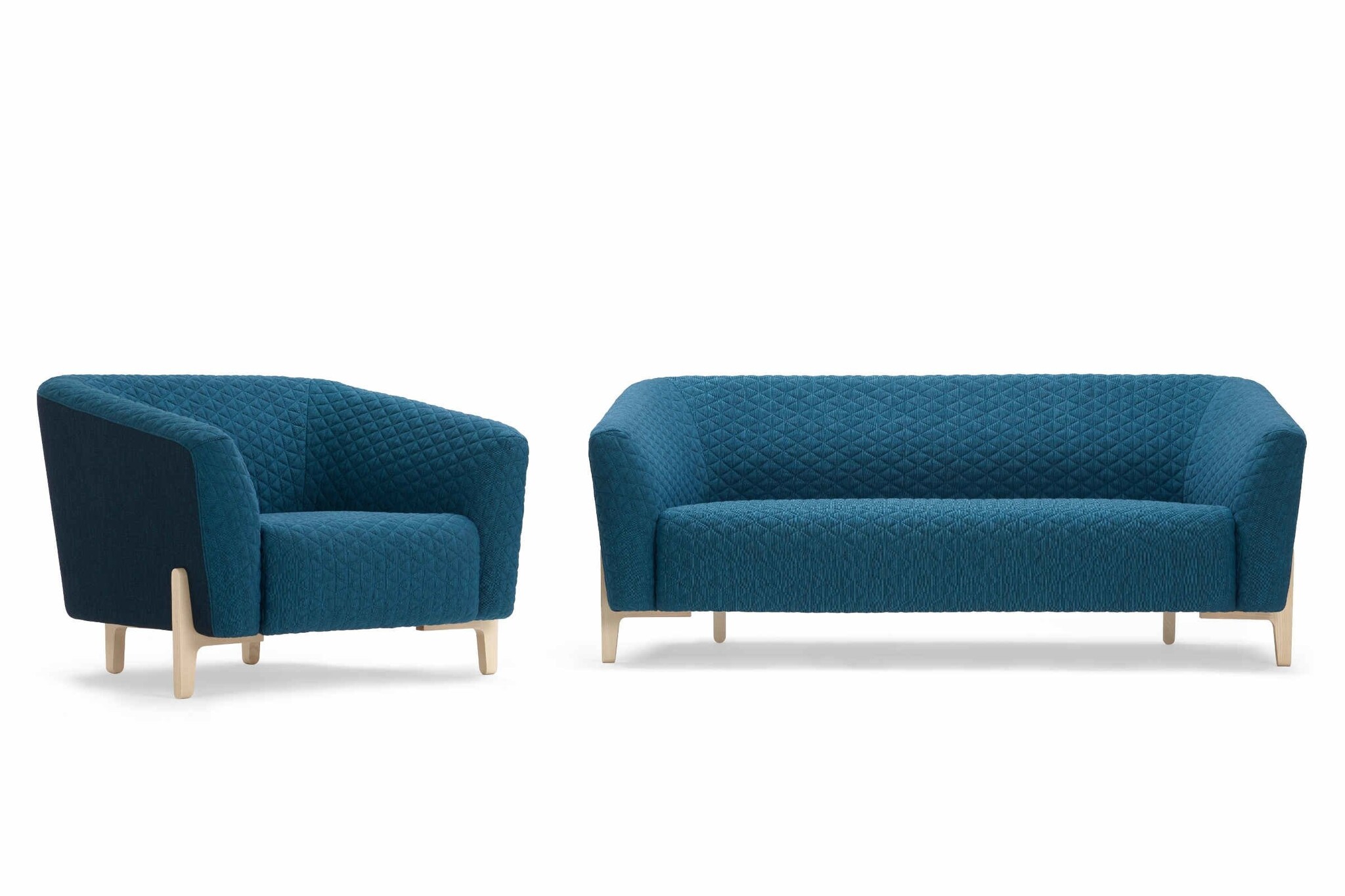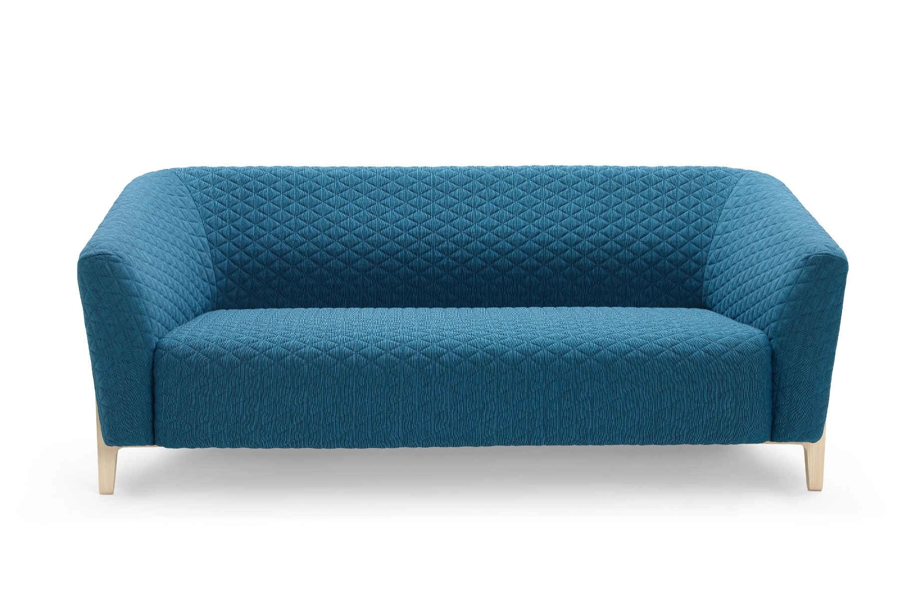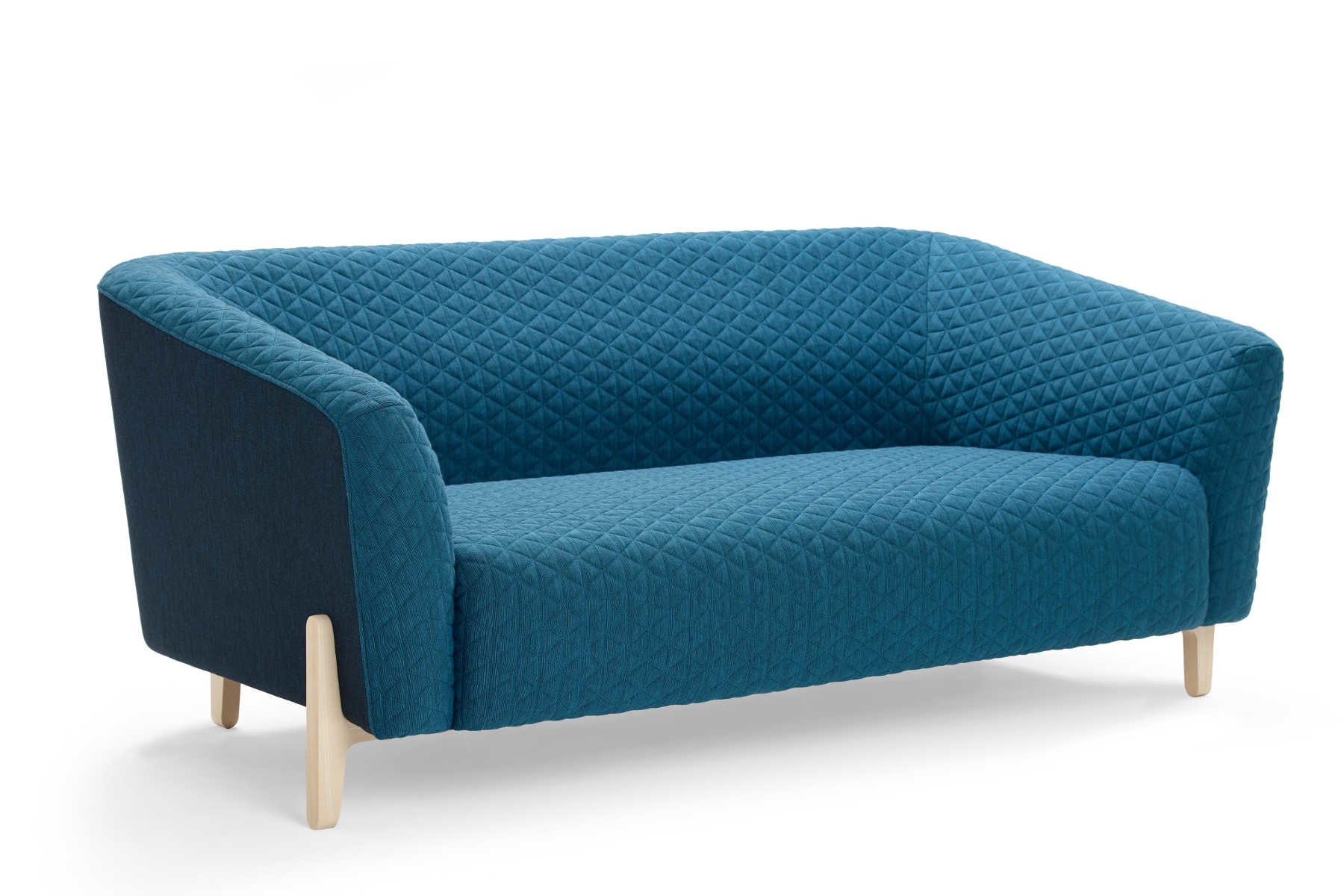 De zitting is gemaakt van gewatteerd textiel, die rust op een subtiel vormgegeven houten frame.
