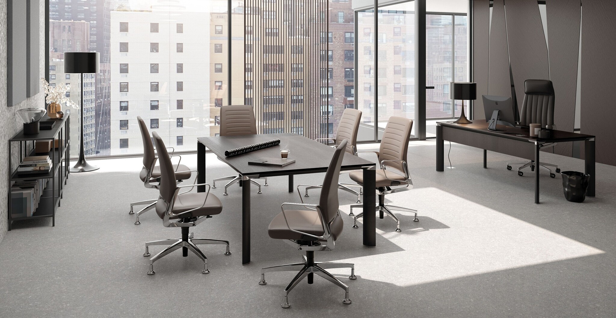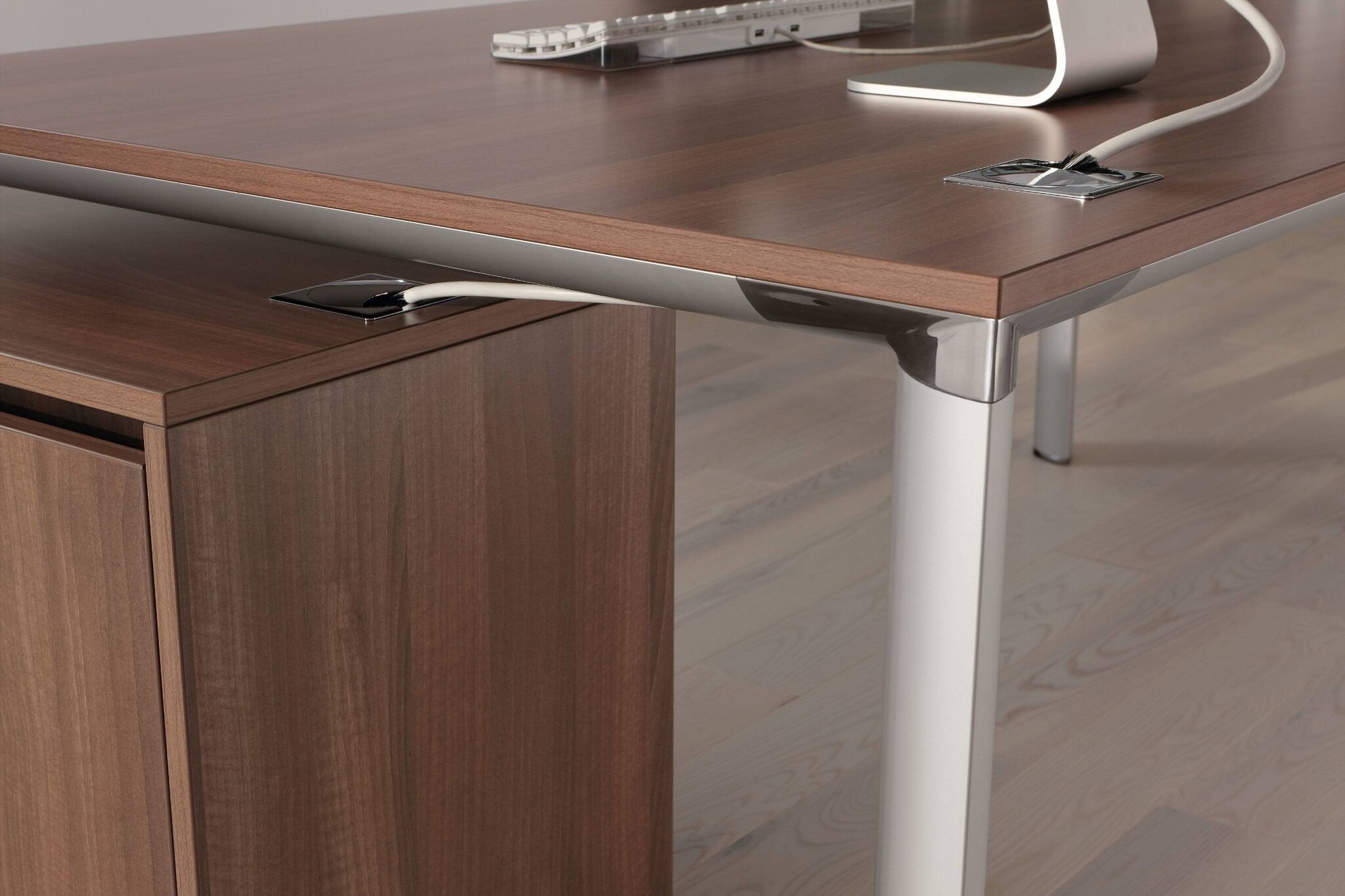 De Palma tafel verbindt een representatieve uitstraling met hoogwaardige materialen en een rijke keuze aan werkbladen. Het tafelsysteem bestaat uit vergadertafels, werkplektafels en directiemeubilair.