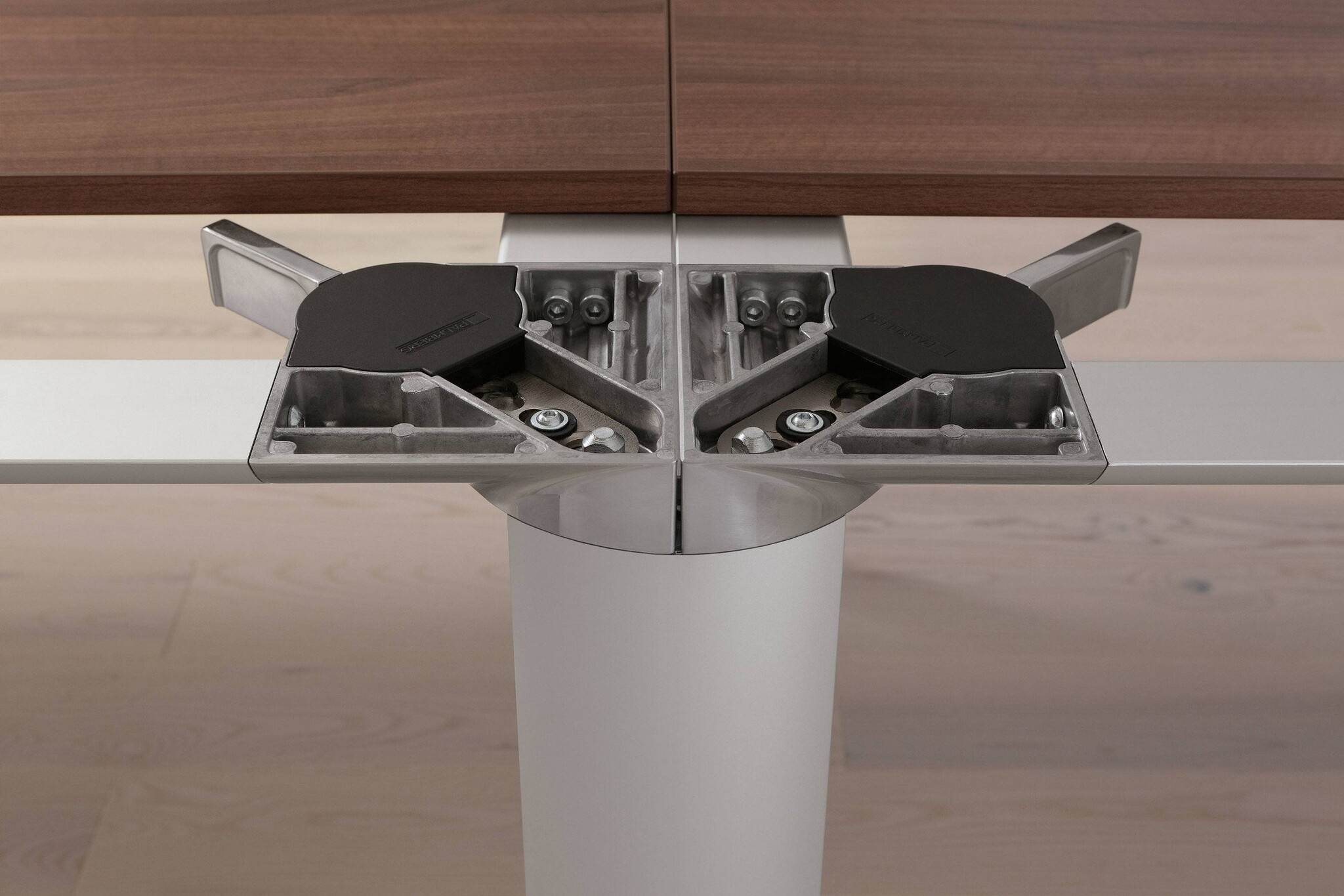 Het tafelsysteem PALMA is ideaal voor bedrijven, die behoefte hebben aan variabele conferentieoplossingen. De conceptionele rangschikking verbindt daarbij hoogwaardige materialen en een gereedschapsloos hefboommechaniek tot een doordacht modulair meubelconcept. Het handige, onder de tafel aangebrachte mechaniek zorgt bij op- en ombouw van zowel kleine als ook grote conferentieoplossingen voor een snelle en flexibele montage zonder gereedschap. De plaatsing van de montagepunten in het qua vormgeving markante knooppunt is daarbij zo gekozen, dat bij elke pootstand een optimale geometrische verbinding ontstaat. Maar PALMA kan nog meer. Ook als werkplekoplossing is PALMA, in combinatie met het kastsysteem SELECT, de juiste keuze. De Palma tafel verbindt een representatieve uitstraling met hoogwaardige materialen en een rijke keuze aan werkbladen. Het modulair tafelprogramma heeft een vaste tafelhoogte van 74 cm en een zichtbaar omlopend aluminium frame.