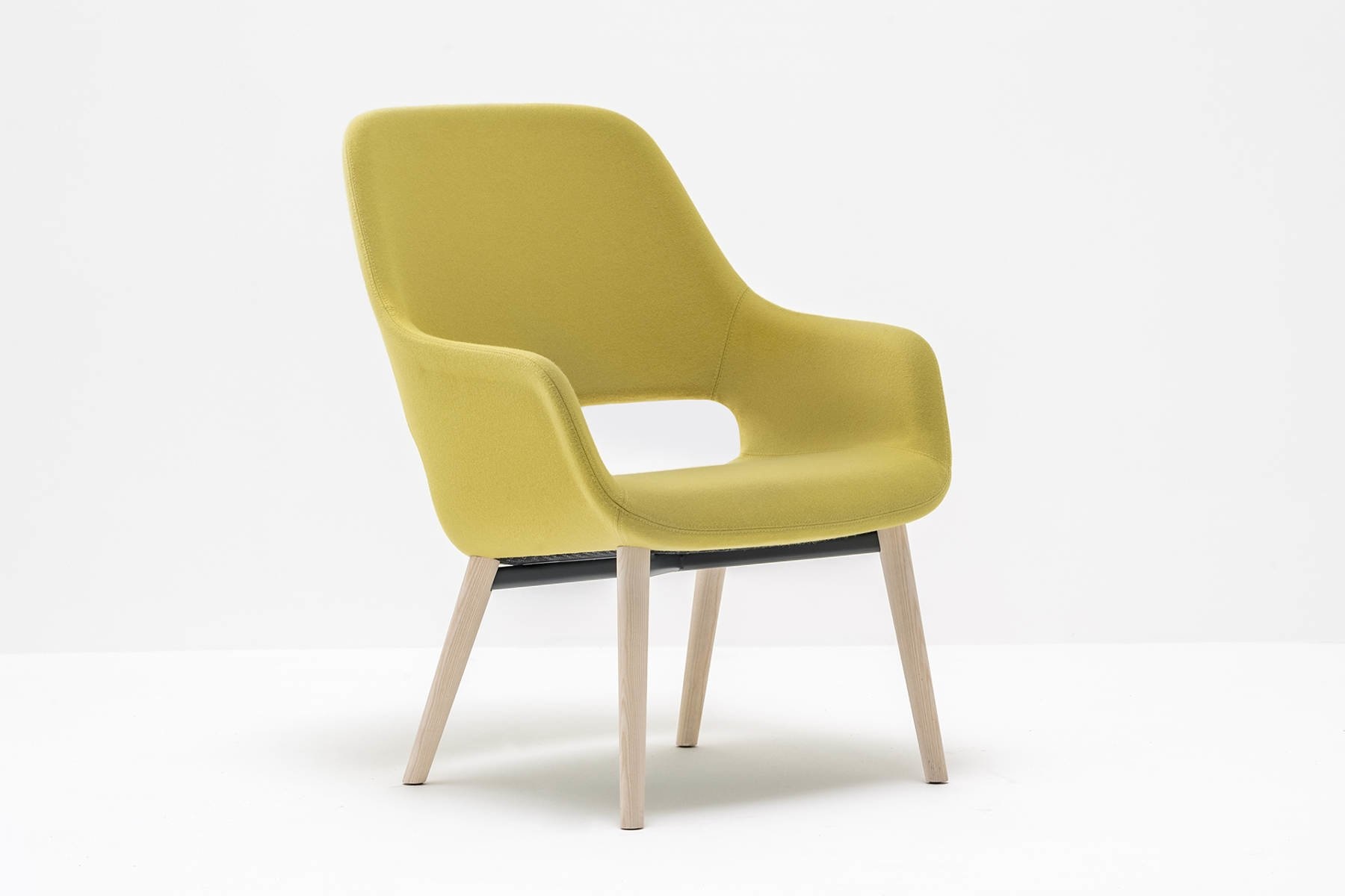 De armleuning wordt bepaald door een afschuining die langs het profiel van de fauteuil loopt.