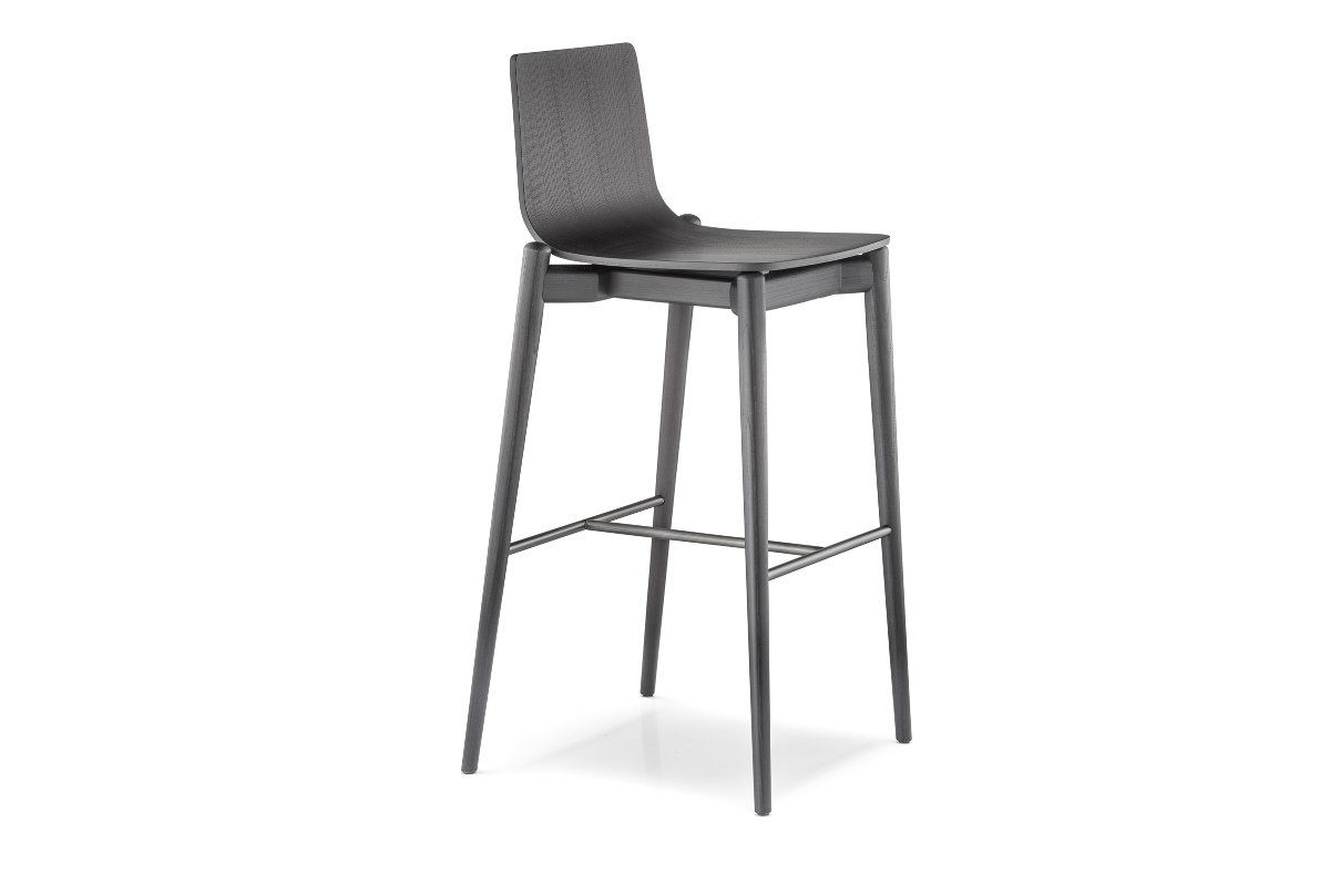 Deze barkrukken zijn gemaakt van massief essenhout en verkrijgbaar in zwart of grijs getint. De zitschaal is gestoffeerd. De zithoogte is 75 cm.