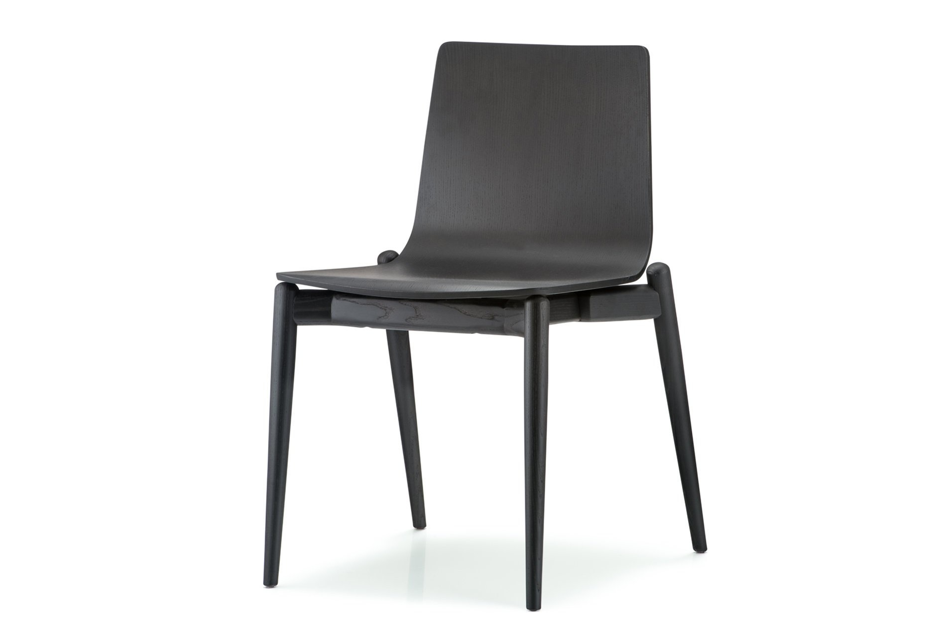 Deze essenhouten stoel is verkrijgbaar in de kleuren, zwart of lichtgrijs getint. De zitschaal is van multiplex. De stoelen zijn stapelbaar.