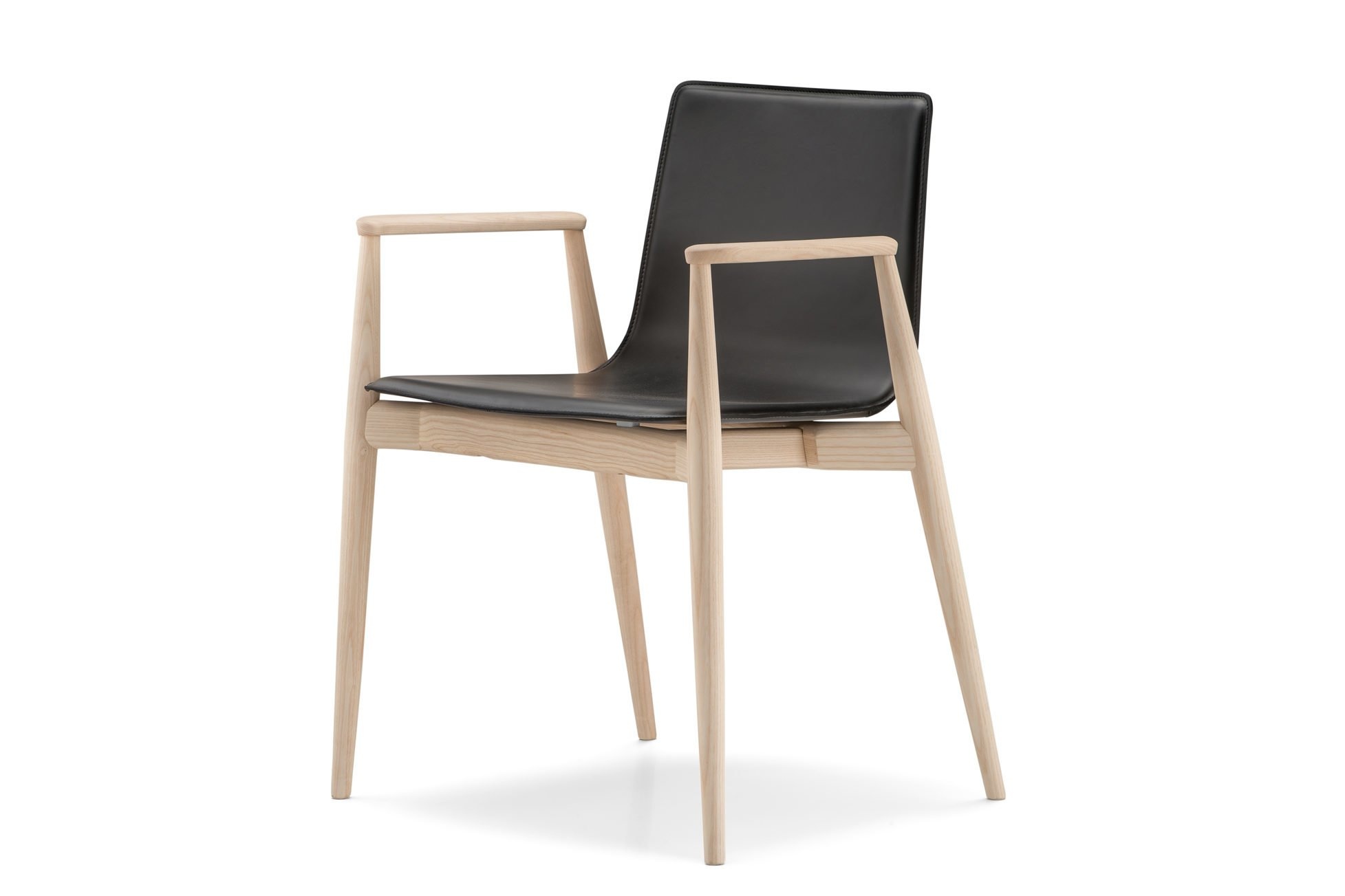 Deze essenhouten stoel met armleuningen is verkrijgbaar in de kleuren, zwart of lichtgrijs getint. De zitschaal is bekleedt met echt leer.