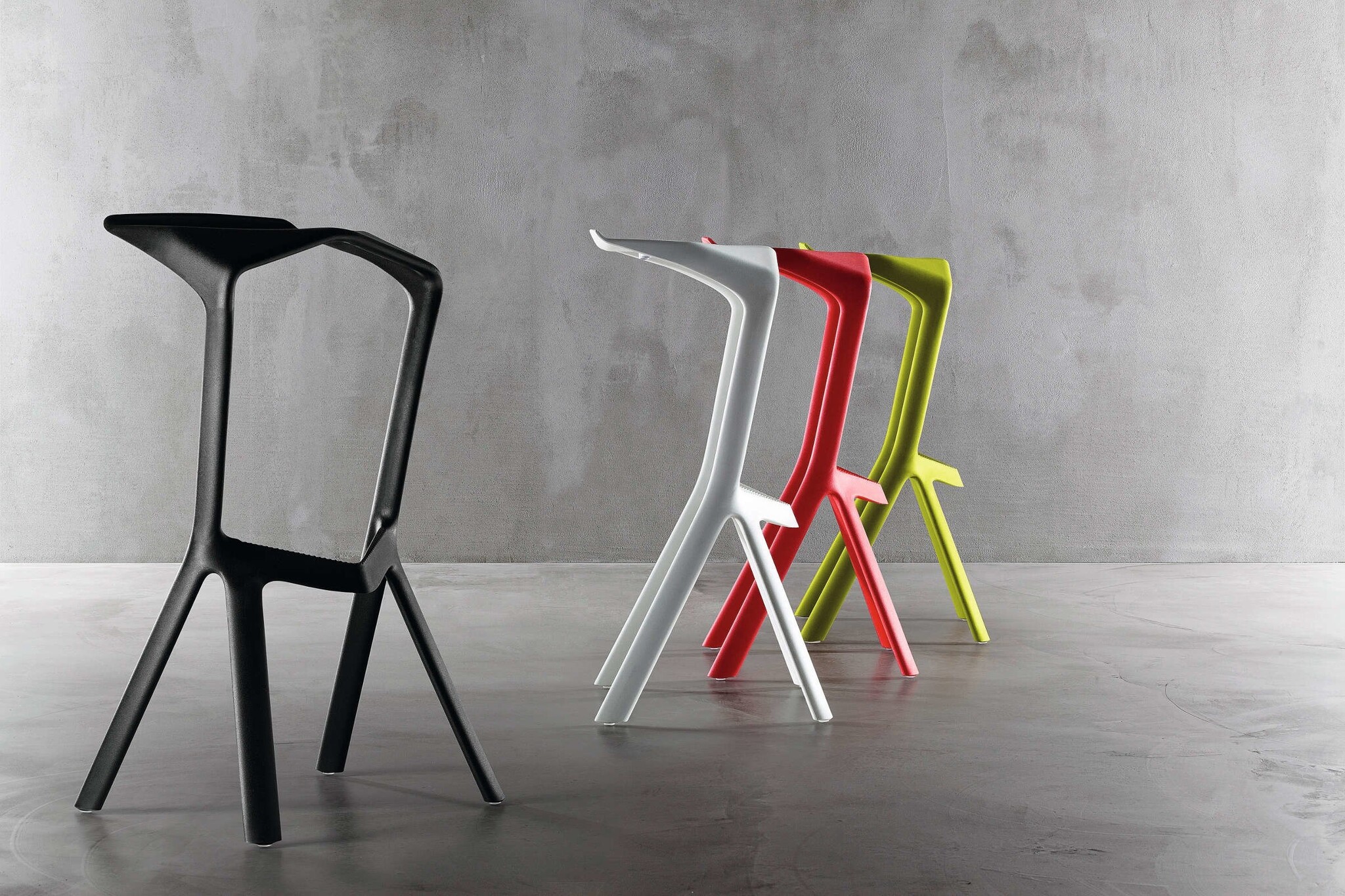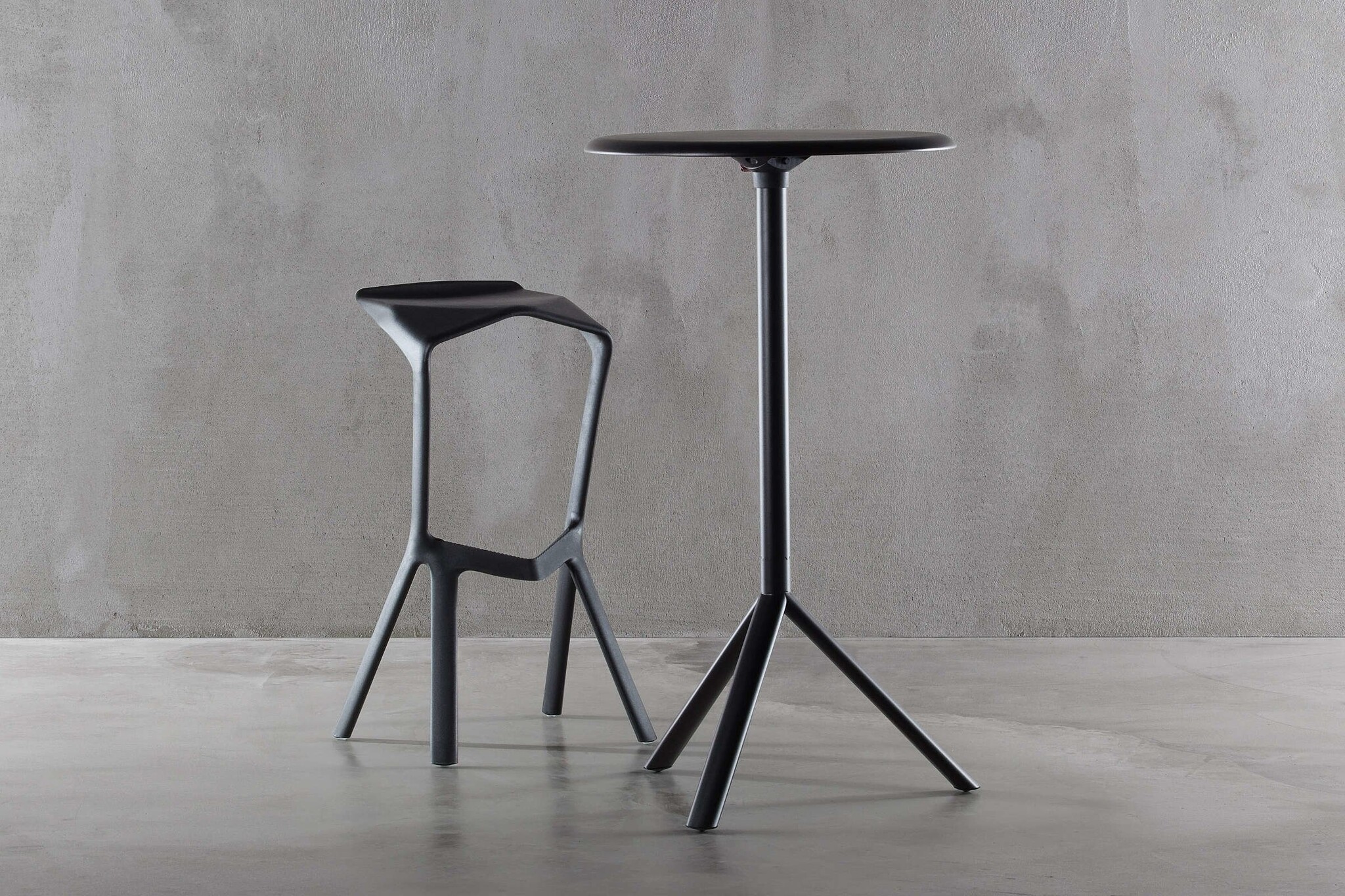 Stapelbaar barkruk uit verstevigd polypropyleen. Leverbaar in de kleuren: zwart, wit-grijs, signaal-rood, oranje, curry-geel, oxid-rood, kobaltblauw. Recyclebaar. De Plank Miura tafel collectie is nu ook leverbaar met een gepolijst aluminium basis.