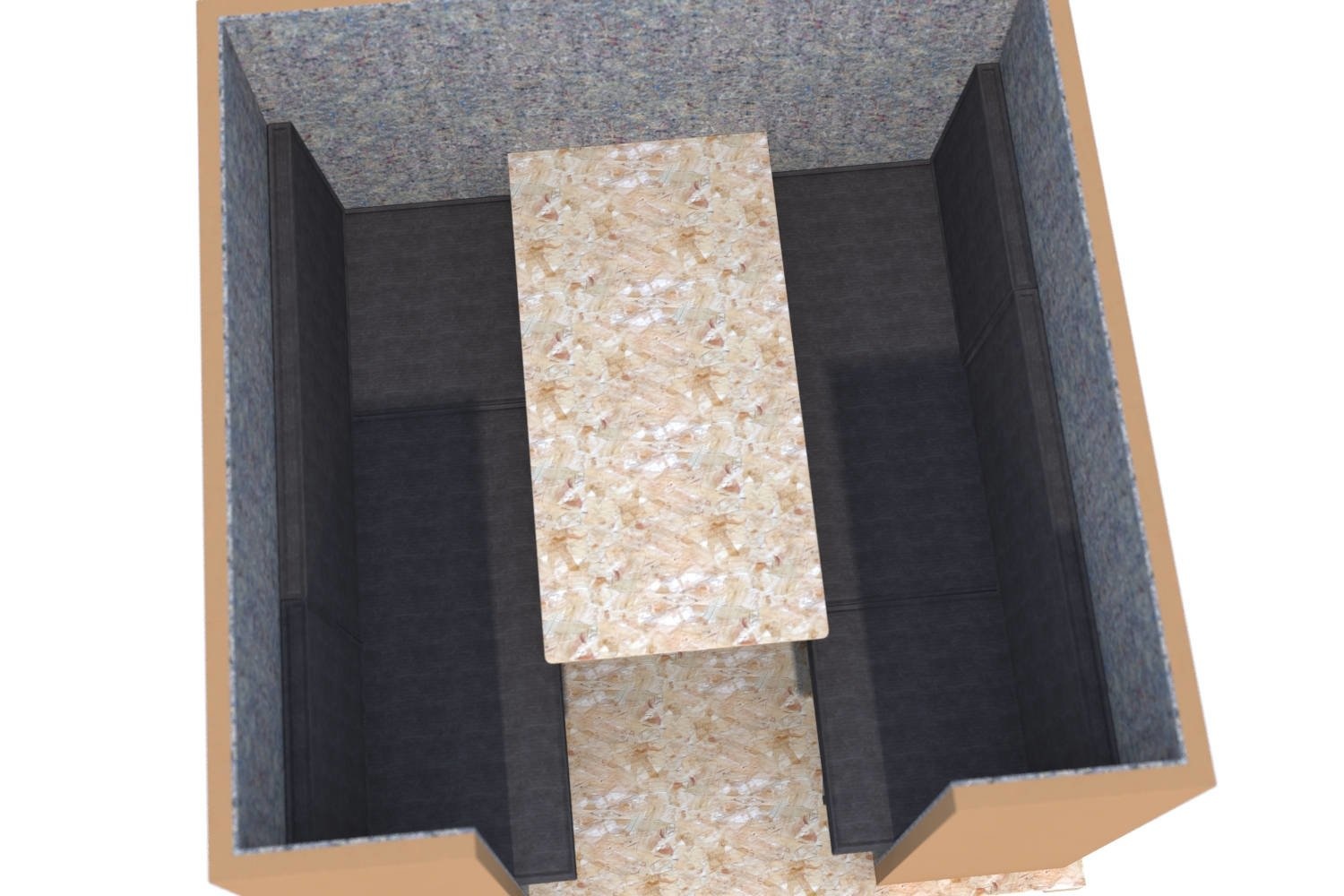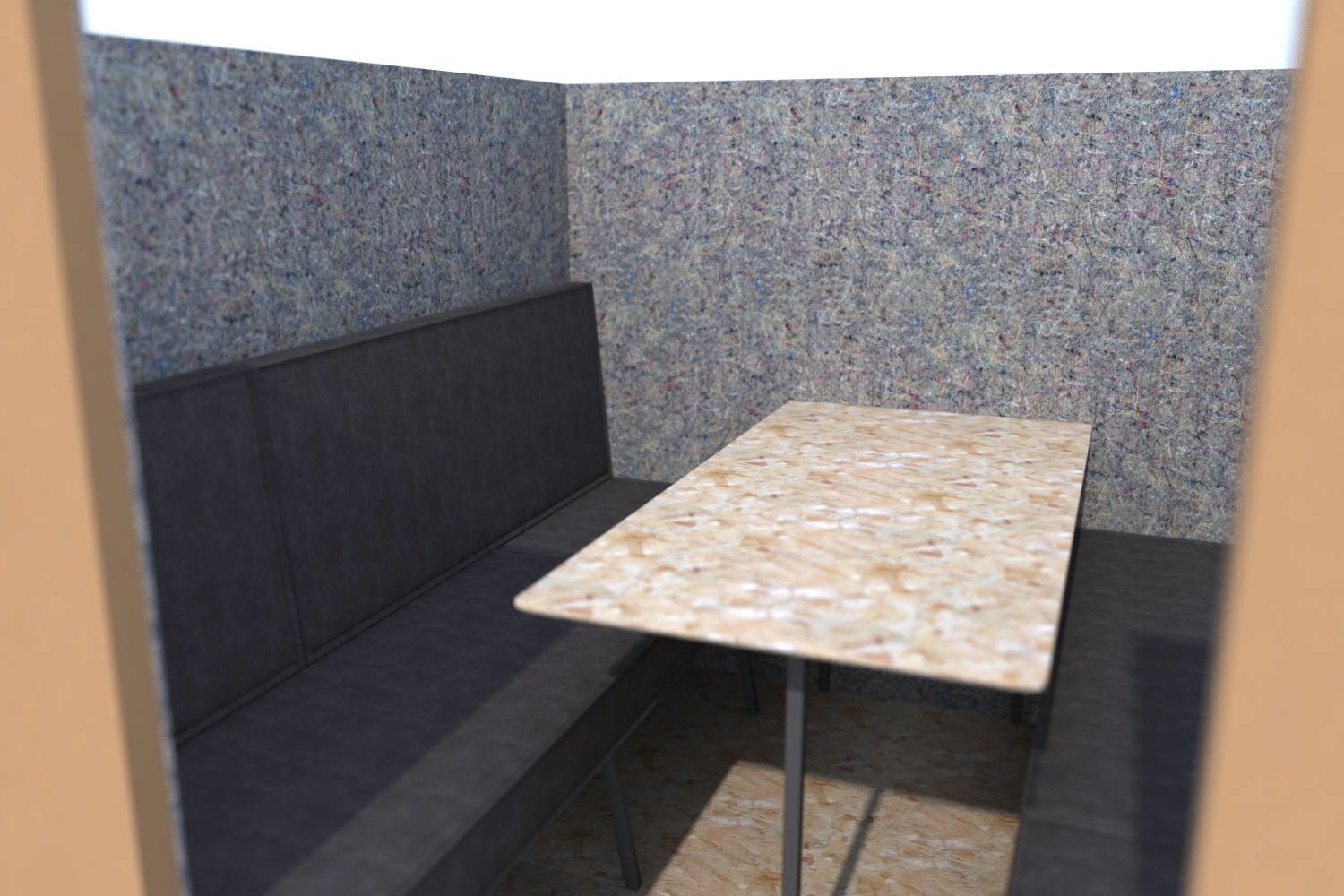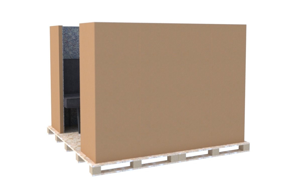 Dit model heeft net als de andere modellen wanden van dik honingraatkarton, die aan de binnenzijde geheel bekleed zijn met akoestisch vilt.