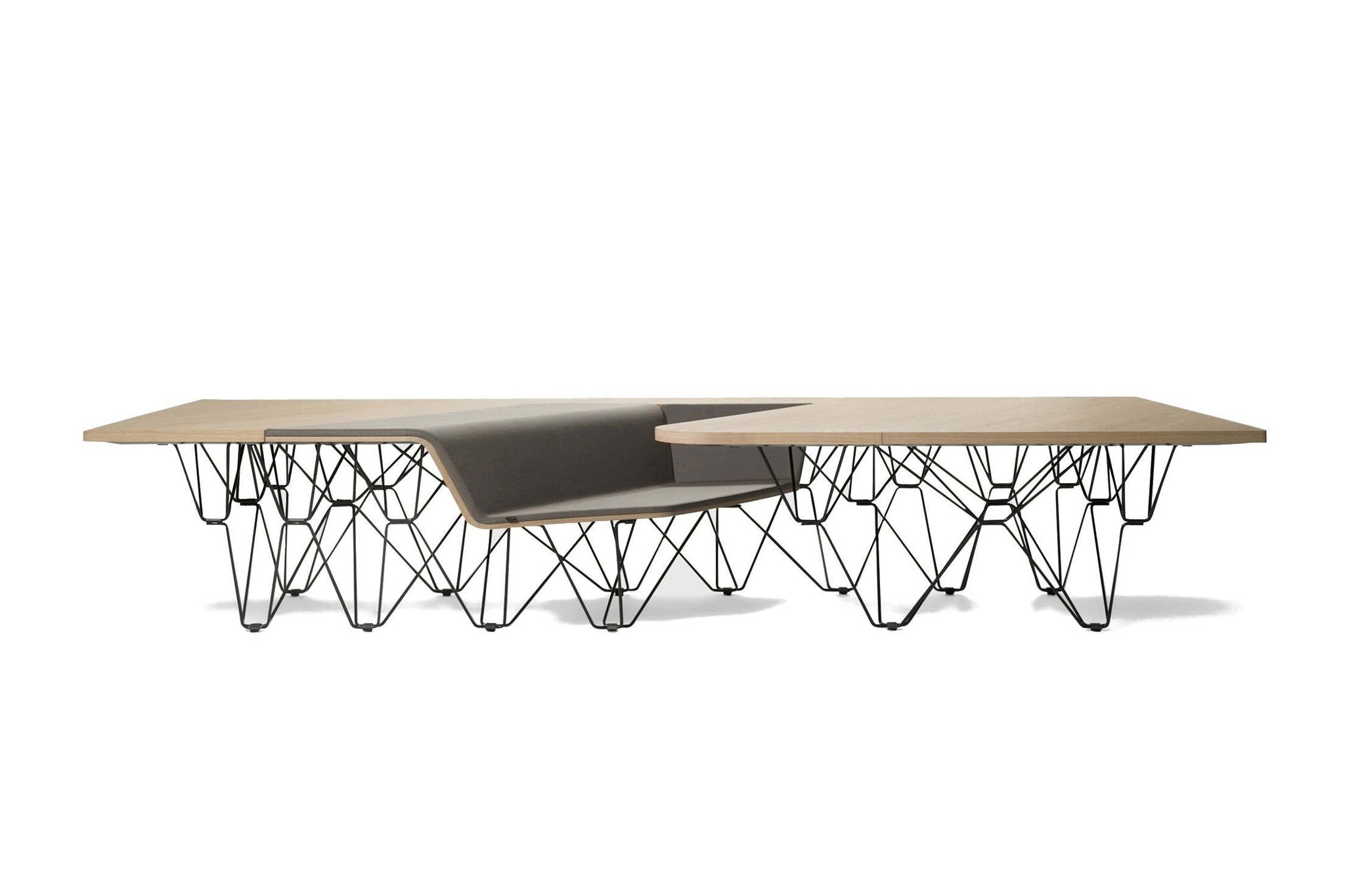De SitTable bestaat uit een houten tafelblad, metalen frame, schuim voor de zitting van de bank.