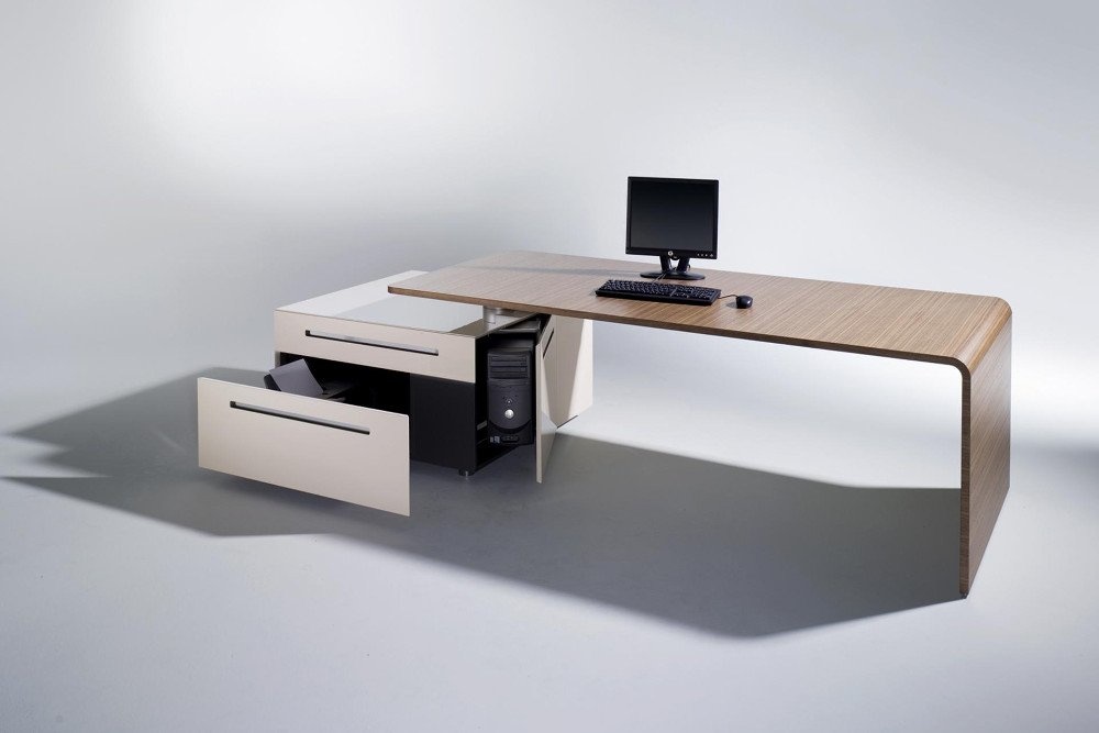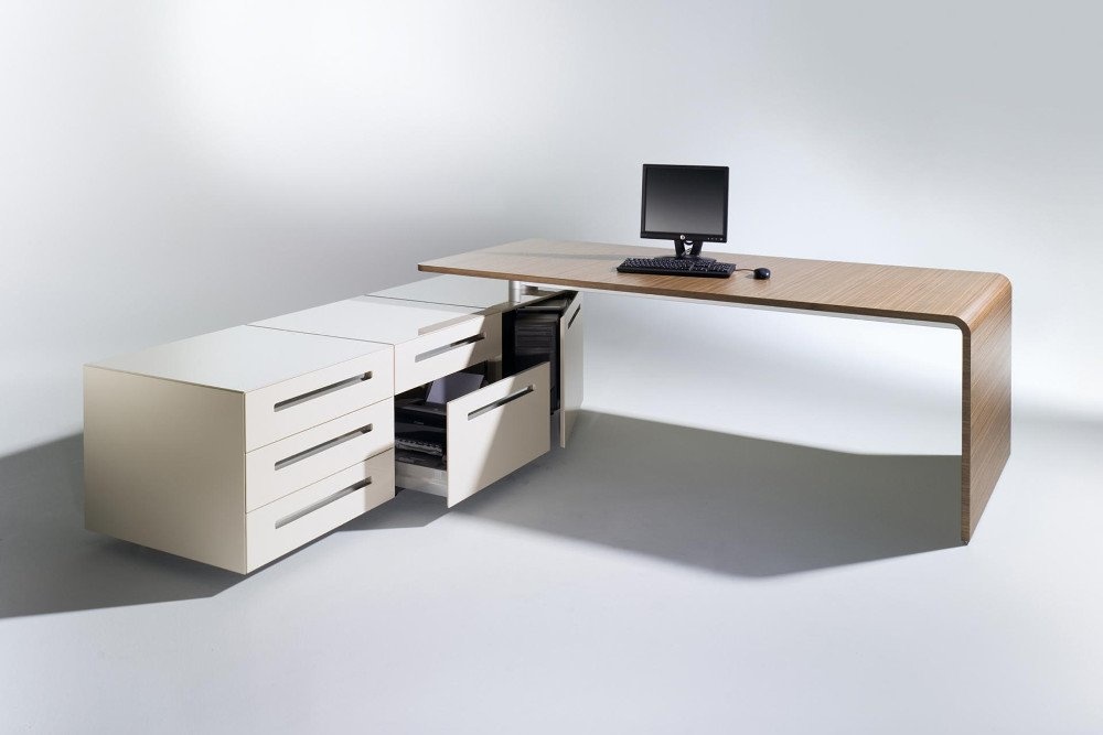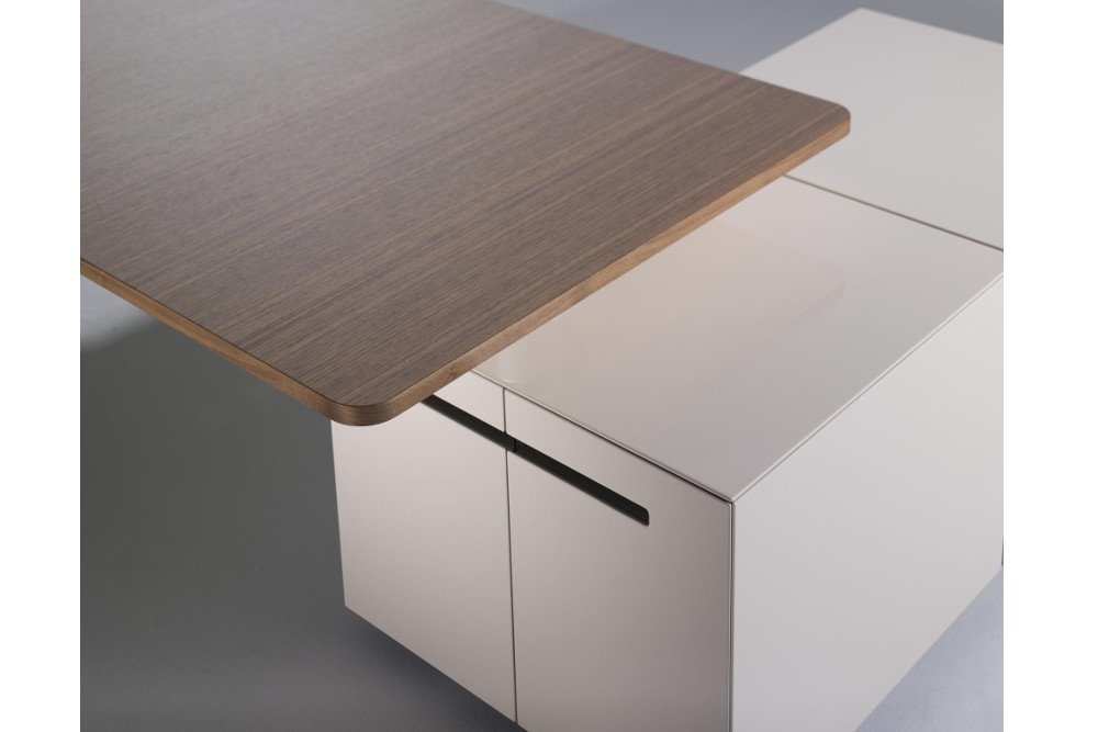 Een tafelprogramma en een modulair containersysteem met intelligente functies. Achter een deur met PC beugel en printerlade laten zich de technische onderdelen zinvol onderbrengen. De containers worden in verschillende hoogglans als ook matglans kleuren aangeboden. Ze kunnen individueel gecombineerd worden. De hoogwaardige fineerafwerkingen van Ahorn tot Zebrano donker gebeitst laten een bijzonder contrast zien. De containers worden in verschillende hoogglans als ook matglans kleuren aangeboden. Ze kunnen individueel gecombineerd worden. De hoogwaardige fineerafwerkingen van Ahorn tot Zebrano donker gebeitst laten een bijzonder contrast zien.