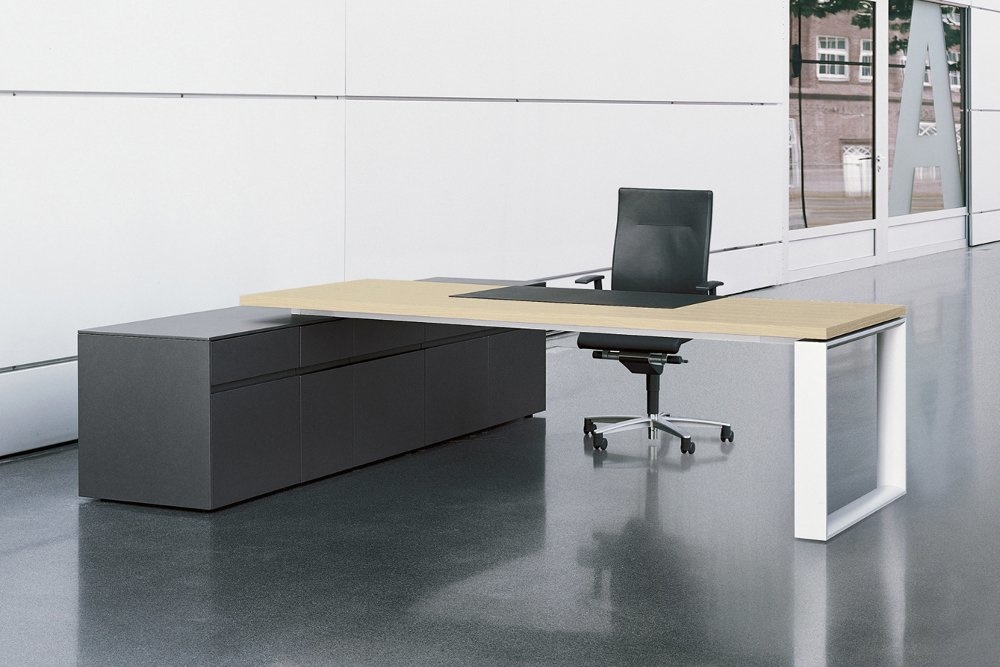 Rechthoekige frames uit aluminium geven de toon aan. Het bureaublad lijkt over het frame te zweven en geeft op deze manier lichtvoetigheid en transparantie aan. Door deze details staan de hoogwaardige materialen in de voorgrond. Een exclusieve verschuifbare lederinlay verdekt vakken die dan in tafelblad geintegreerd zijn. Afleg voor accessoires en aansluitingen voor stroom/data-telefonie behoren dan tot de mogelijkheden van Renz Sono.