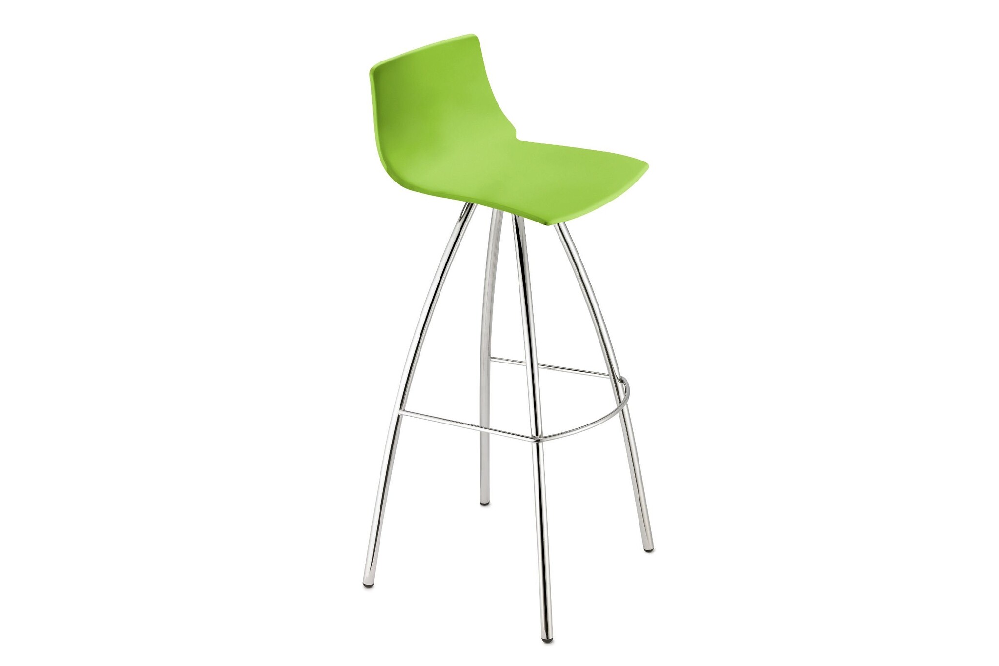 Day 82 is een hoge kruk op verchroomd 4-poots frame met een voetensteun en een kuip van recyclebaar polypropyleen.