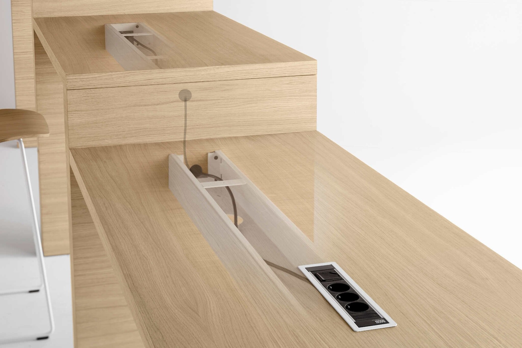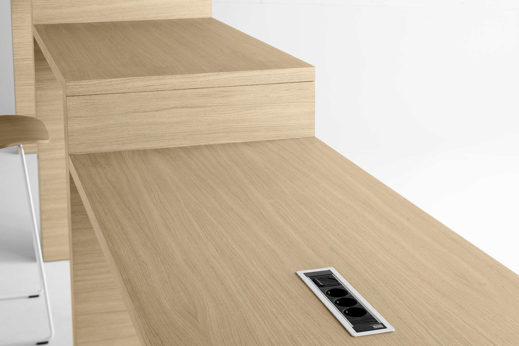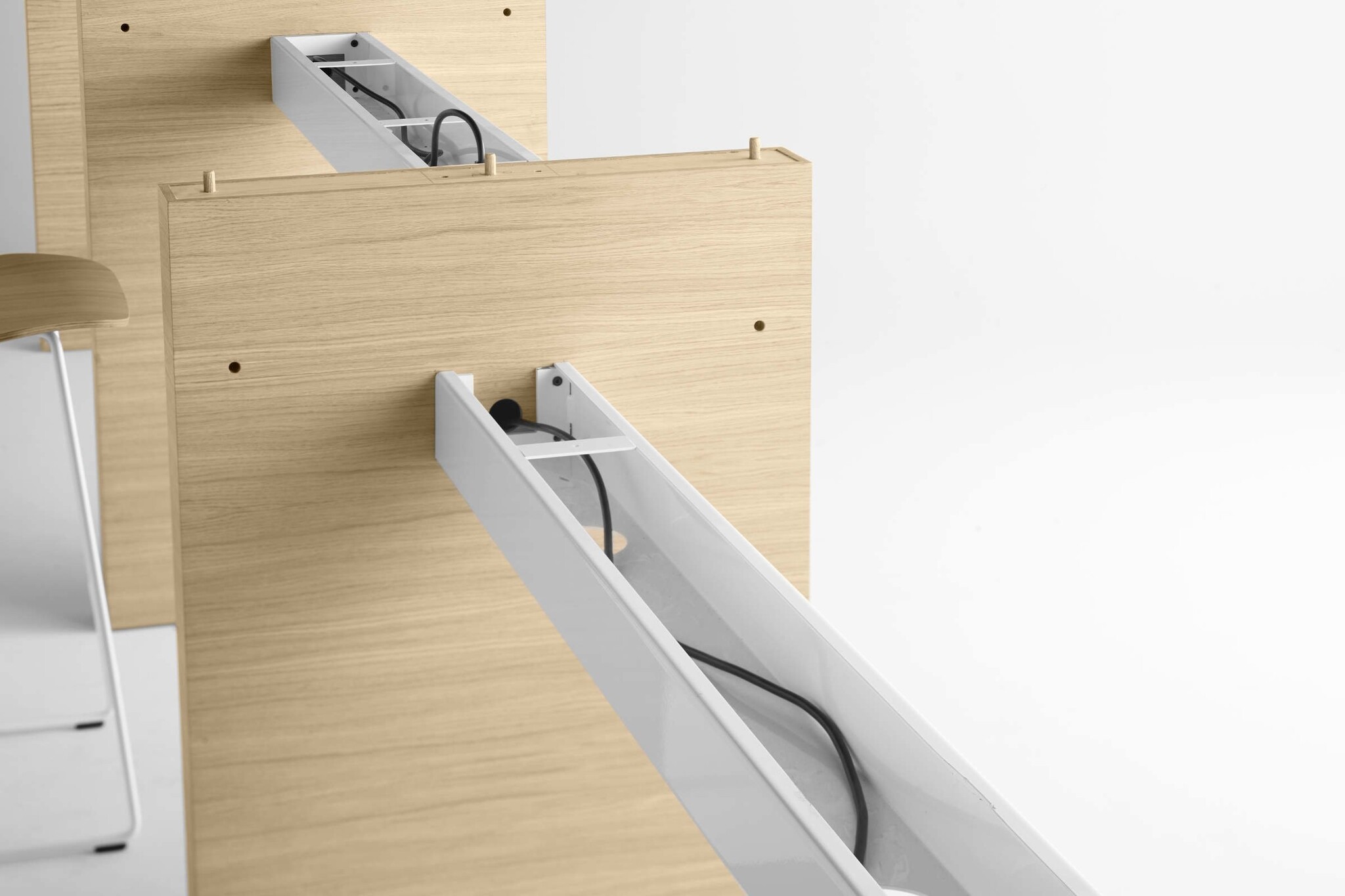 Indien u kiest voor elektrificatie in de tafel, zal dit mooi weggewerkt worden door de kabels in de poten te stoppen. Hierdoor heeft u zowel fysiek als visueel geen last van deze snoeren.
