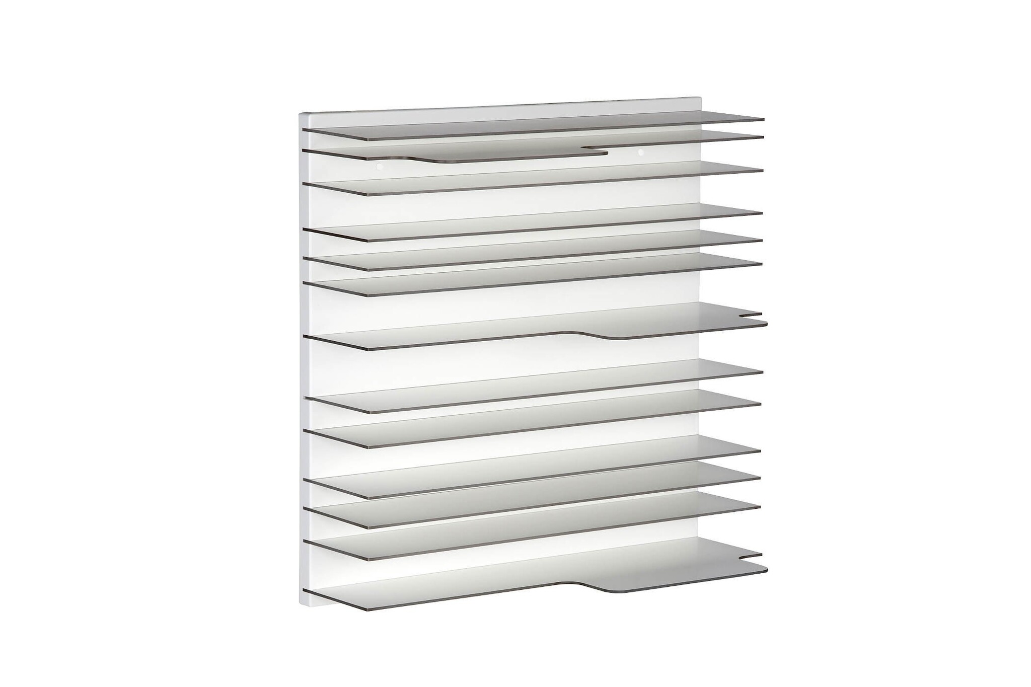 Per wandplaat worden 13 losse volkern legplanken 120x15 cm of 60x15 cm geleverd met een dikte van 4 mm, die vervolgens in de sleuven geschoven worden.