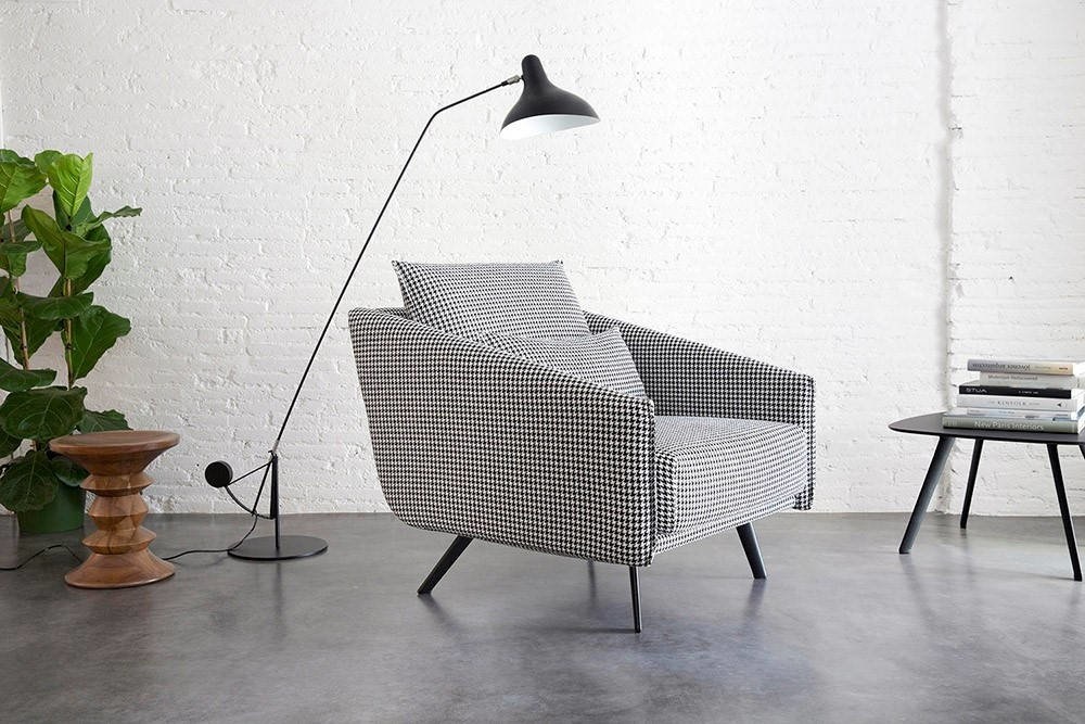 De fauteuil kan over zowel een stoffen (in totaal zo’n 70 keuzes) als lederen bekleding beschikken.