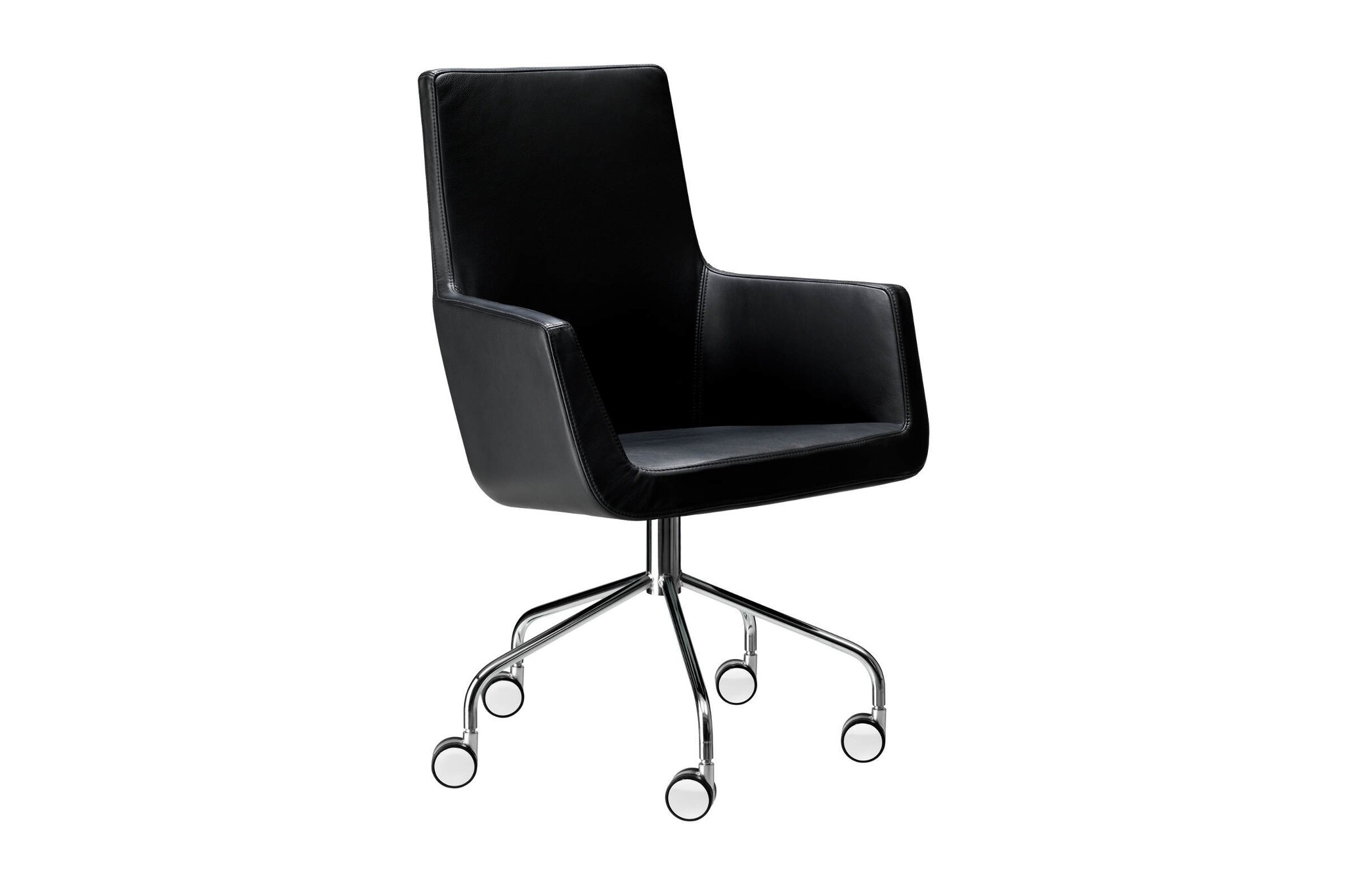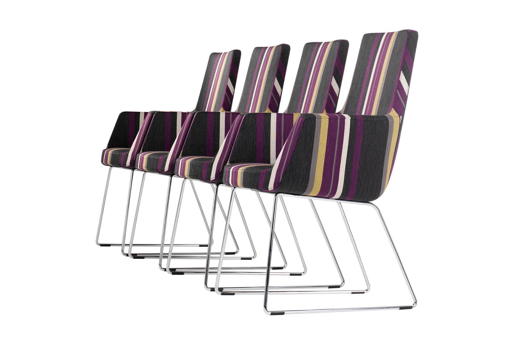 De Happy Swing stoel, sierlijk en passend in de collectie met fauteuils, bannken en (bar)krukken. Het frame van de Happy Swing heeft een stalen buis waaronder een 5 teens stalen draaivoet of stalen schrijf draaivoet in chroom afwerking of gelakt zilvergrijs zit. De fauteuil kan ook voorzien zijn van een roestvrij stalen slede onderstel, sledestoelen. De vulling is van gegoten koudschuim en pascal pocketveren.