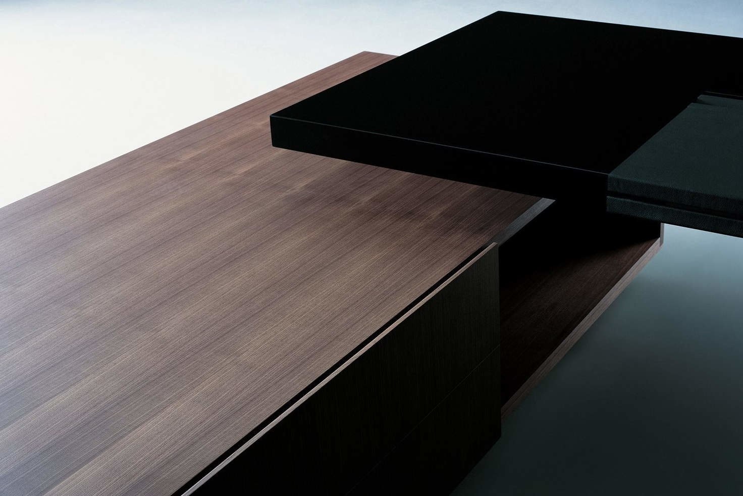 De werkbladen van de bureaus kunnen worden afgewerkt in matte of glanzende witte en donkergrijze lak of in lichte, of donkere eiken, grijze en donkerbruine lak.