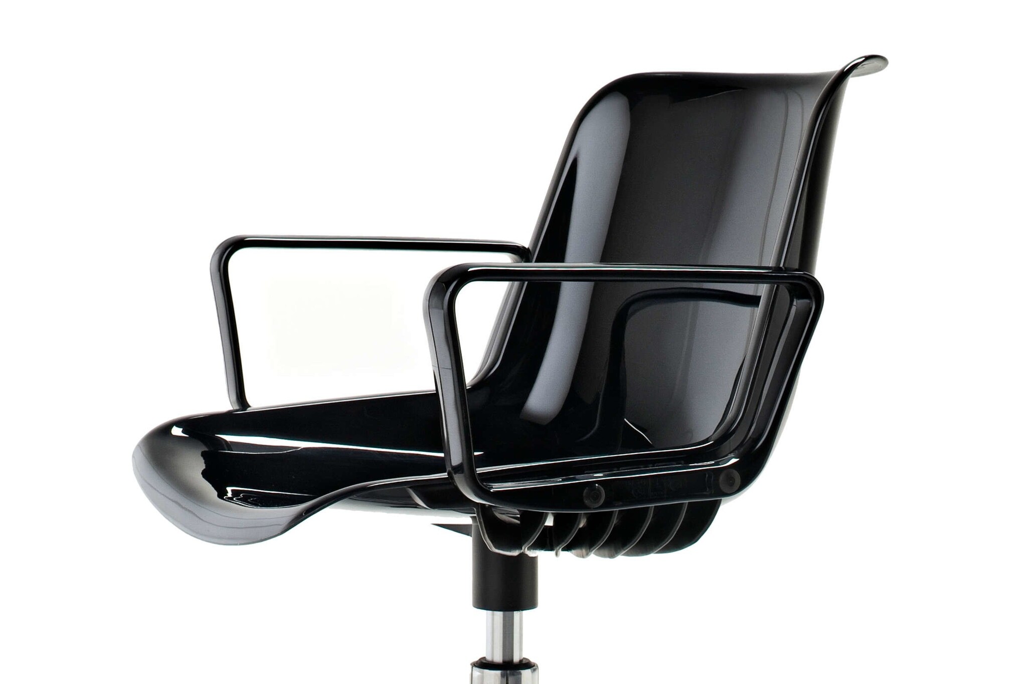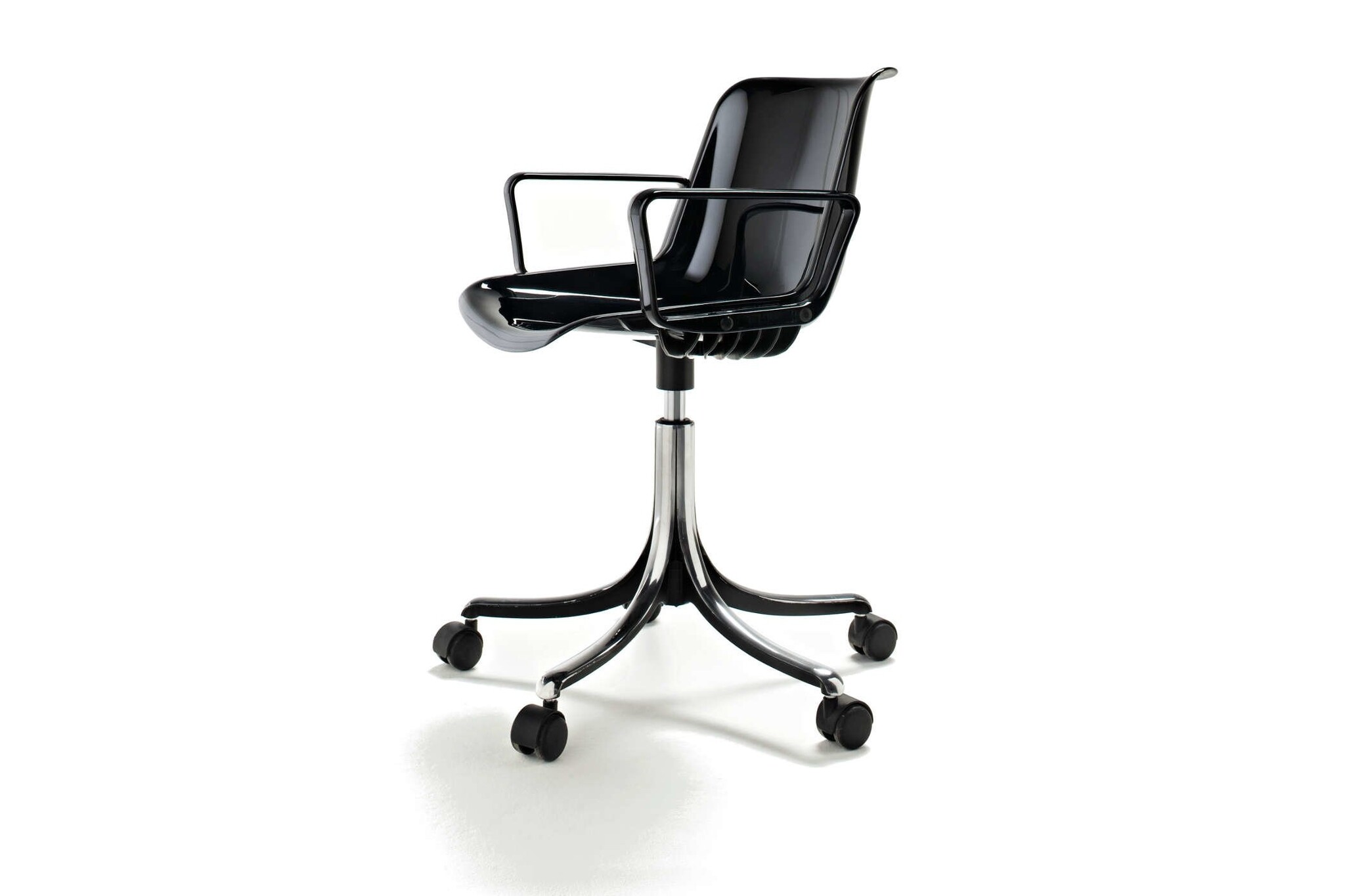 als draaibare stoel op een 5-ster met een basis in gepolijst gegoten aluminium en optioneel uitgerust met gewatteerde bekleding, armleuningen, hoogteverstelling, met poten of op wielen.