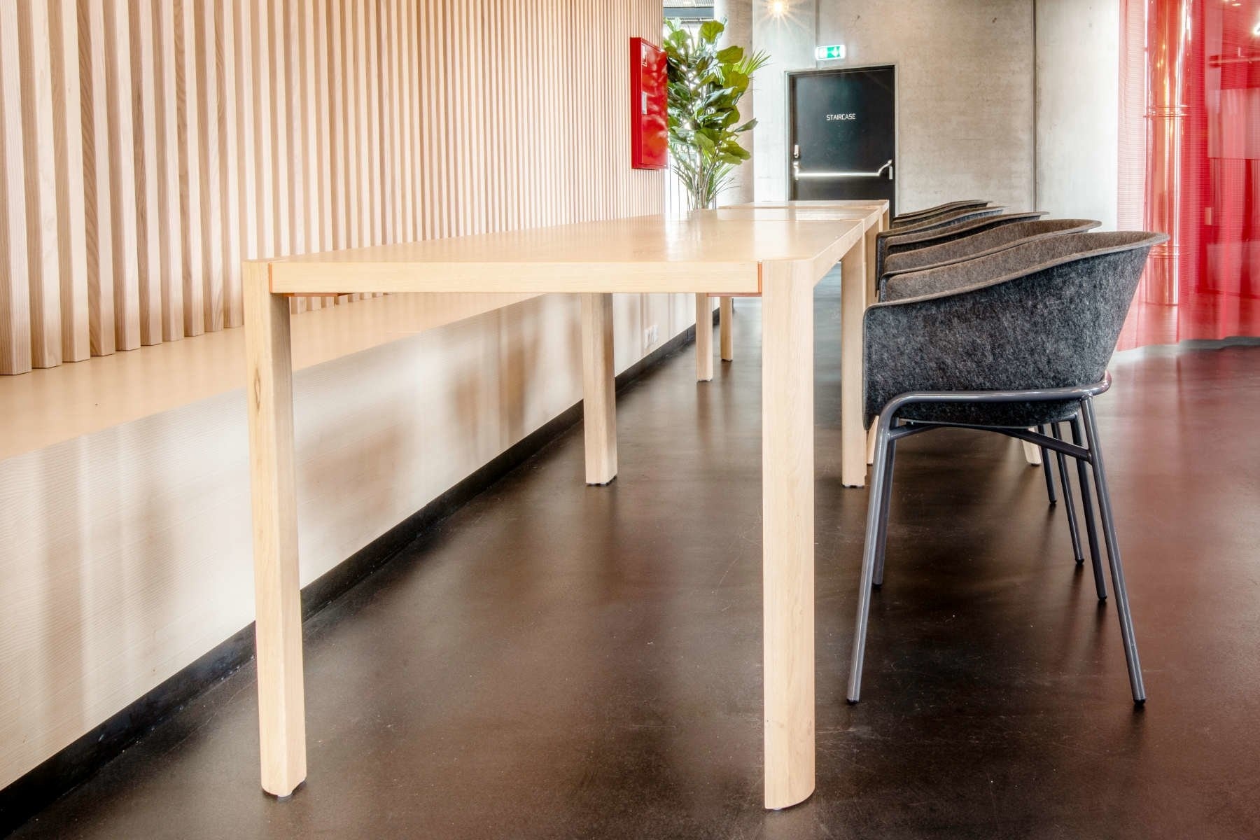De Thonet 1140 is een fraaie tafel van eikenhout met afgeronde hoeken en multi-inzetbaar. Dankzij de slimme constructie van het frame zijn stoelen met armleuningen ook onder de uiterst robuuste en stabiele tafel te schuiven. Hierdoor is de Thonet 1140 tafel goed toe te passen als tijdelijke werkplek of als vergadertafel, aangezien vergaderstoelen vaak een armleuning hebben. Ook in de horeca past deze tafel die een warme uitstraling heeft. Kies uw formaat welke het beste bij uw inrichtingsconcept past. Uiteraard kan een expert van Tint Office u helpen bij het maken van de keuze. De zwarte of aluminium verbinders van de tafelpoten en het blad geven een speels effect in de tafel.