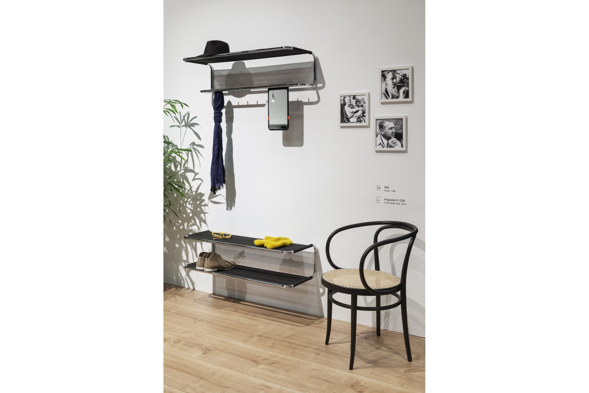 Thonet S1520 kapstok is gemaakt van stalen buizen. De stalenbuizen zijn dragers van netwavebespanning, dit is ideaal voor het plaatsen van hoeden, tassen en schoenen. Tot de wandgaderobe serie behoren die verschillende modellen; Thonet S1520: wandgaderobe met hoedenplak en 10 haken. Thonet S1521: schoenenkast en wandboard. Thonet S1522: wandgaderobe met memoboard.