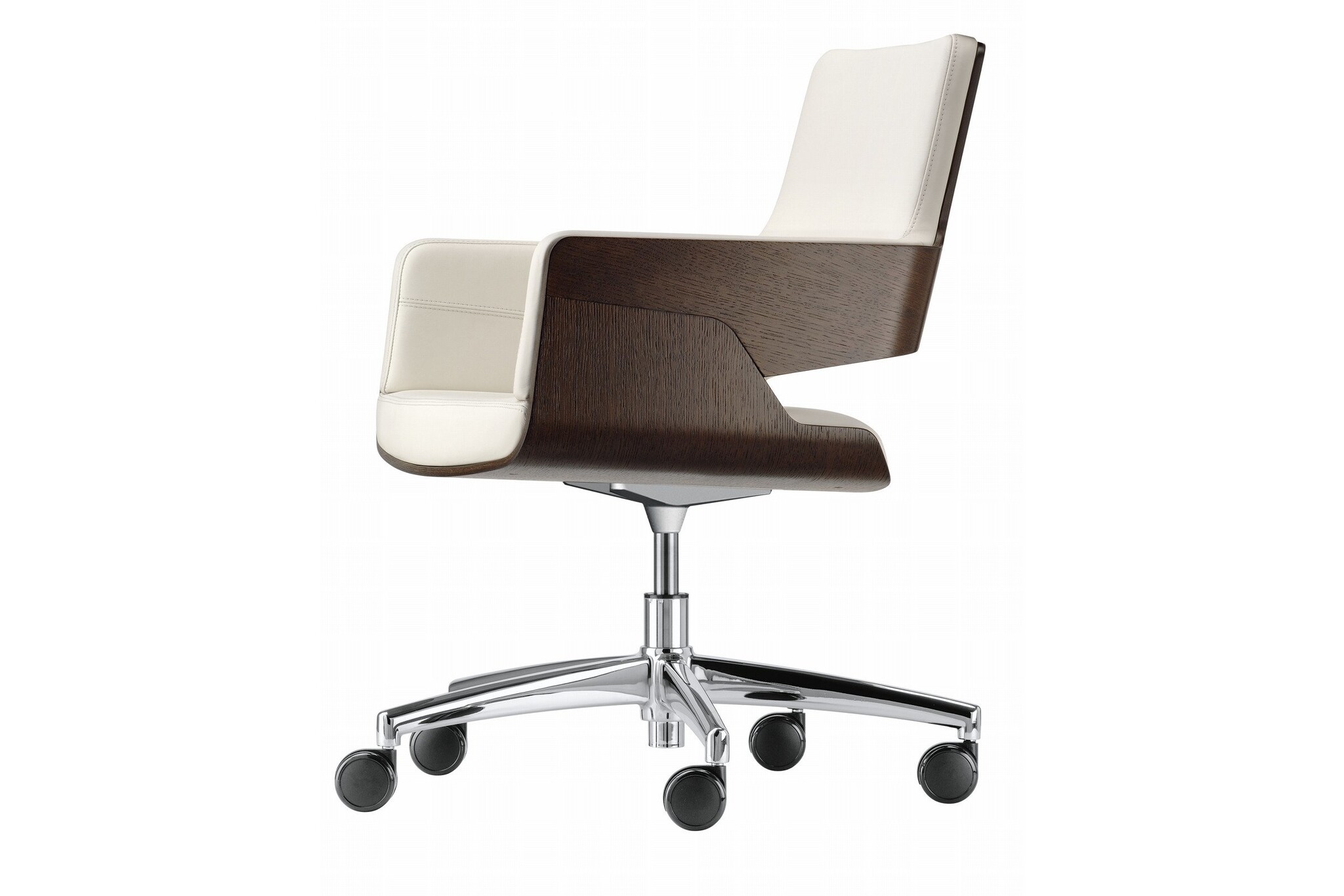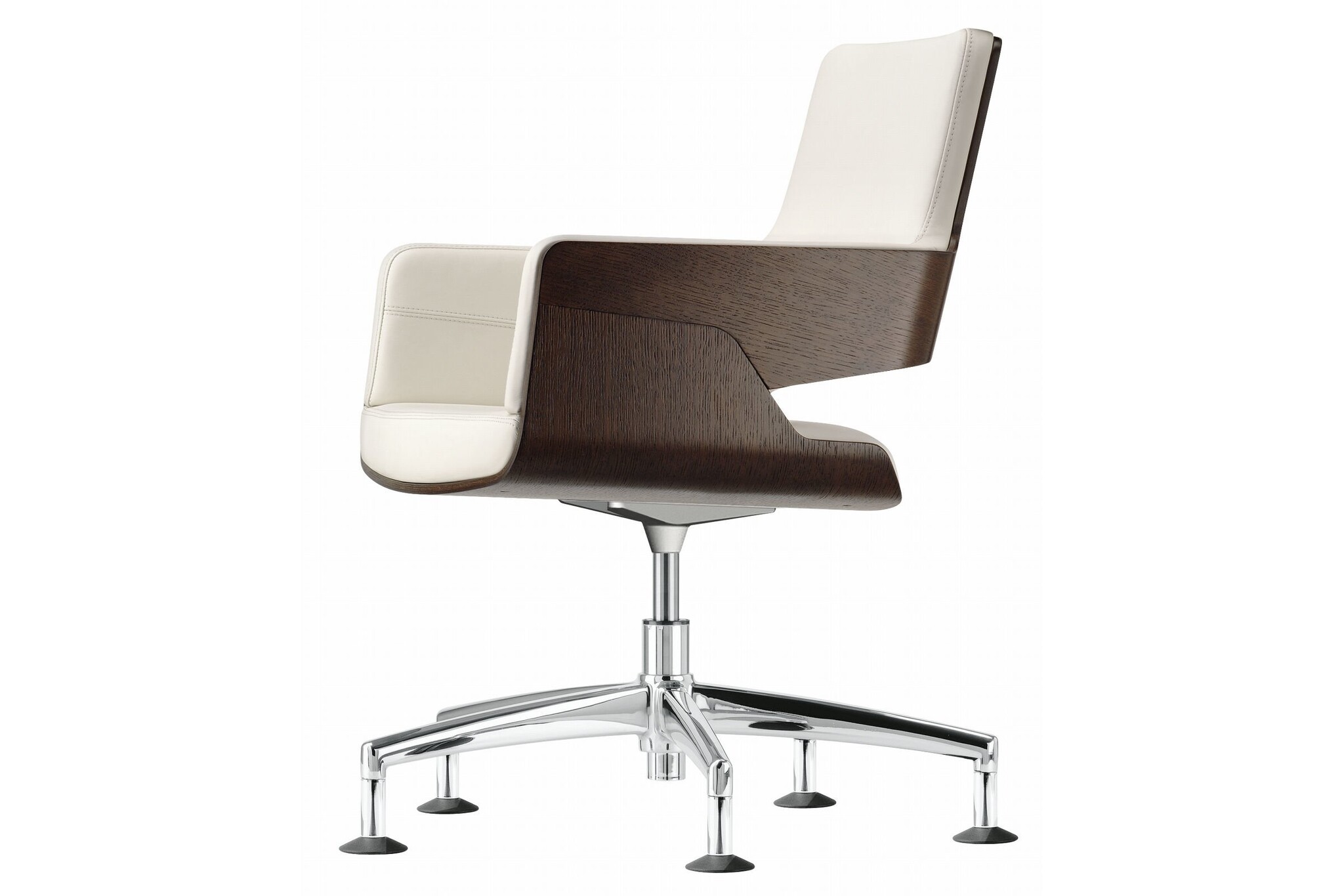 De Thonet S845 stoel kan toegepast worden in ontvangst- en vergaderkamers. De zitschaal is gemaakt van voorgevormd multiplex. Door het gebruik van fineer in diverse houtsoorten en beitskleuren alsmede door de verschillende soorten bekleding in stof en leder past de stoel binnen verschillende kantoorstijlen. Zo ook in die van u! De Thonet S845 is leverbaar op een 5-teens kruisvoet op wielen of glijders. De draaibare stoel heeft een terug draai mechanisme, waardoor de zitkuip altijd weer automatisch in de oorspronkelijke positie terugdraait.