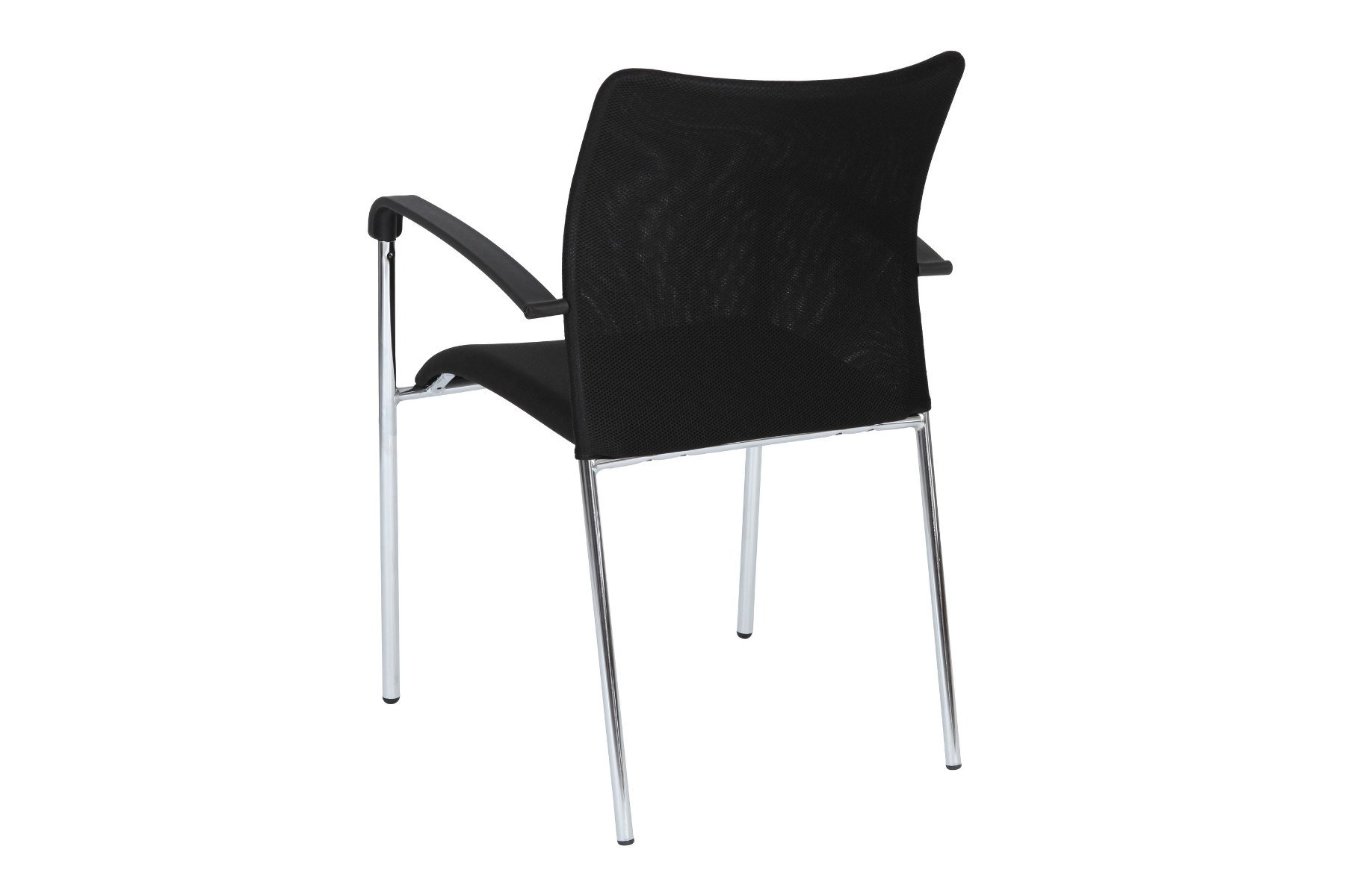 De rugleuning is in zwart mesh en het frame is uitgevoerd in chroom. De stoel heeft 4 poten en de armleuningen zijn voorzien van een kunststof armlegger. De zitting is van een slijtvaste zwarte stof (100.000 Martindale). Martindale is een meeteenheid die aangeeft hoe slijtvast de stof is, 100.000 is voor een vergaderstoel erg hoog dus wij kunnen u garanderen dat deze stoel een aantal jaar meegaat.
