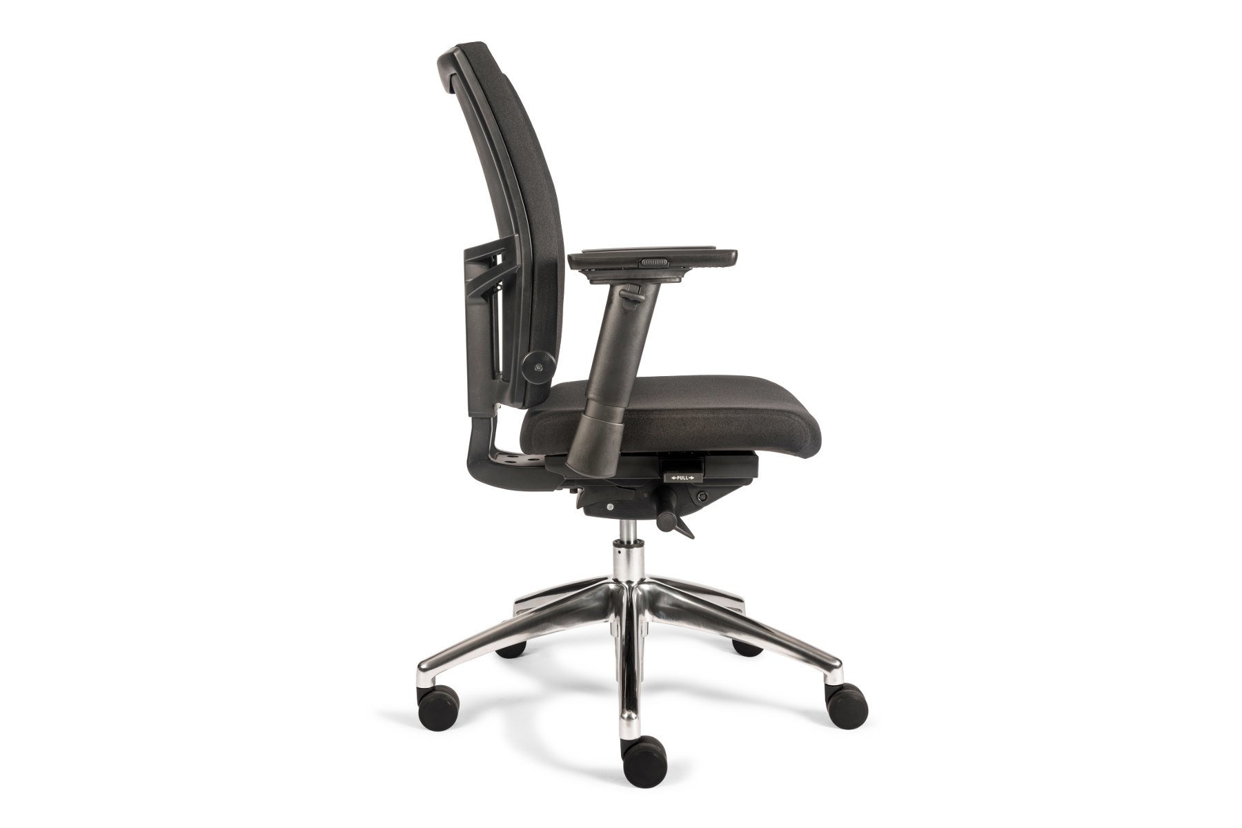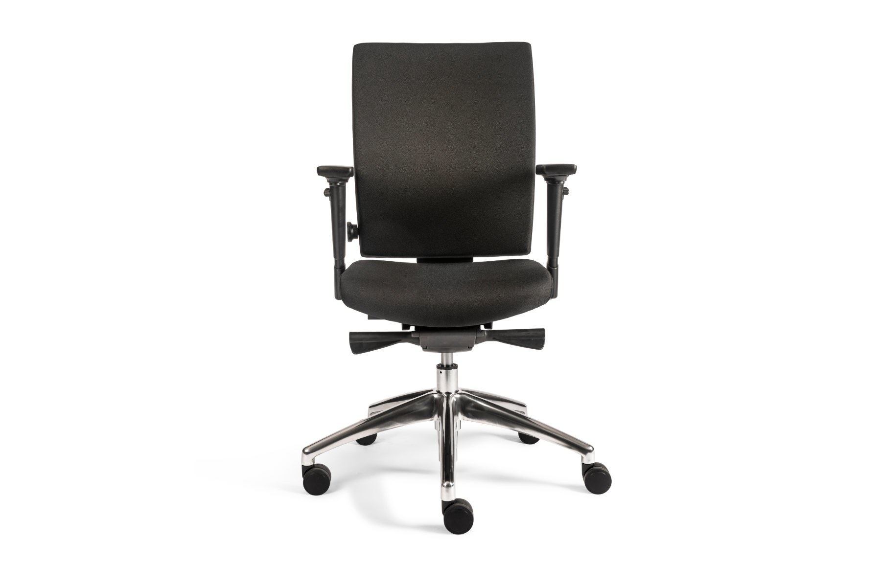 De Tint Bureaustoel Automatic Gestoffeerd is, zoals de naam al doet vermoeden, verkrijgbaar met een gestoffeerde rugleuning en zitting. Kunststof armleuningen en een gepolijst aluminium onderstel.