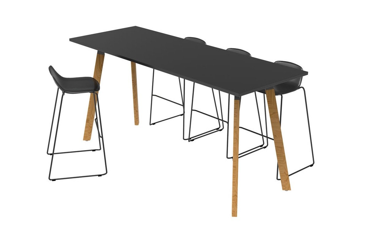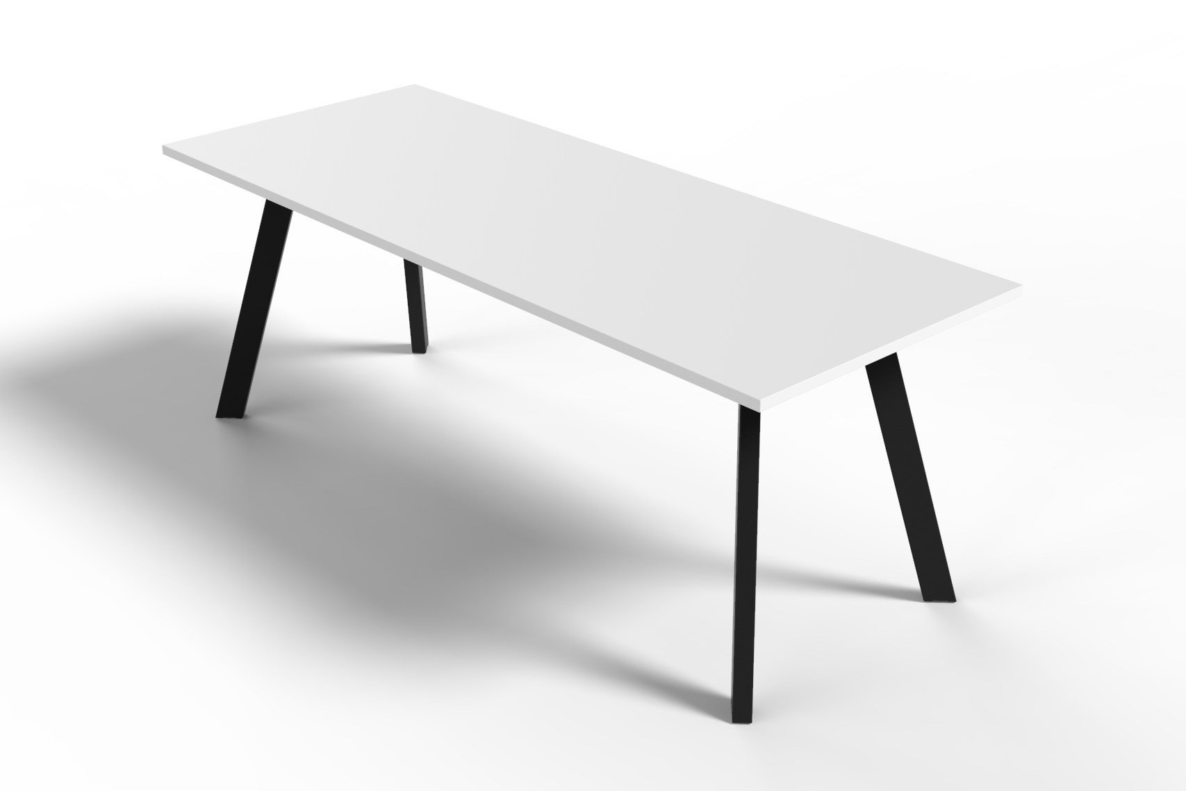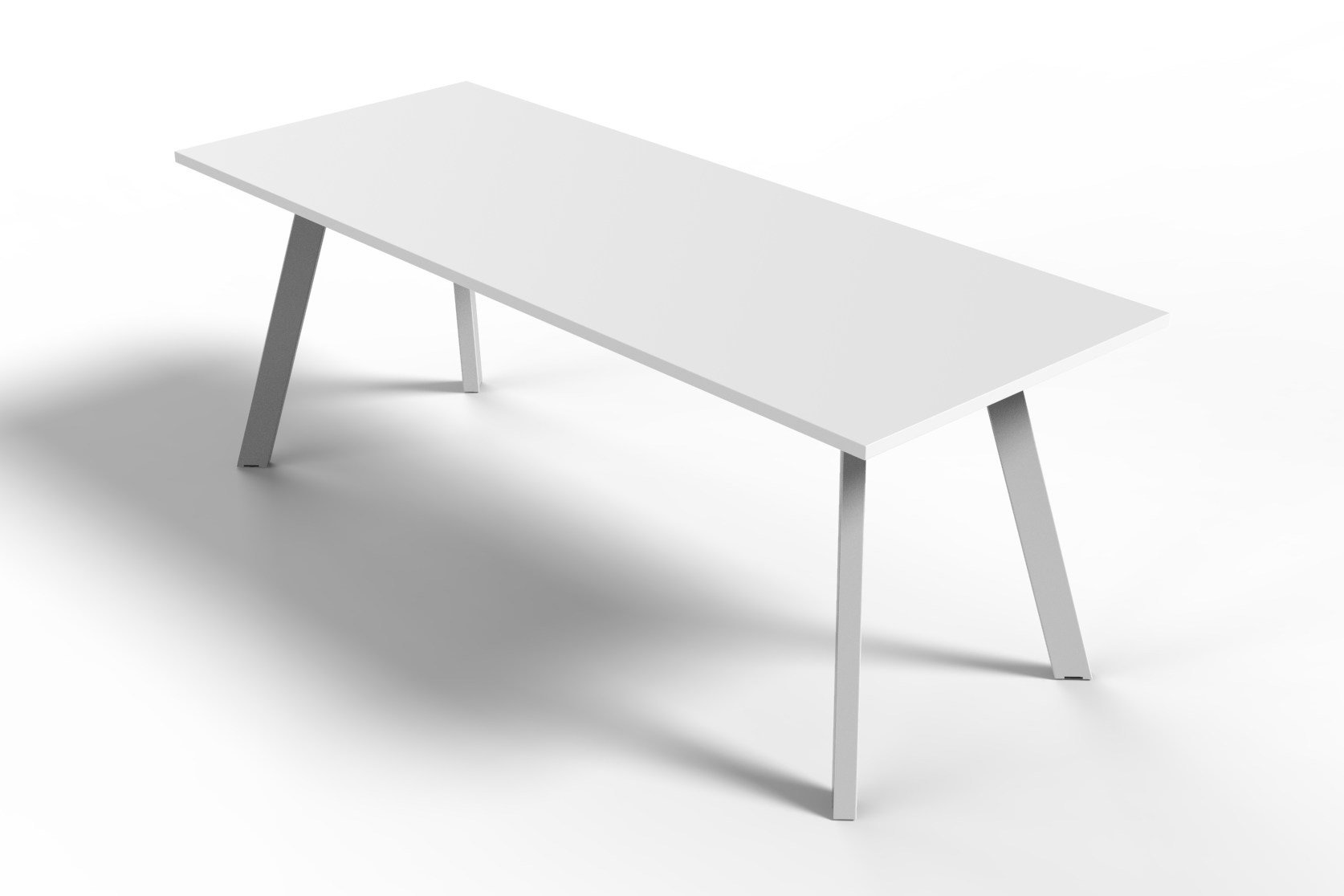 De vergadertafel is leverbaar in verschillende soorten afmetingen. Het onderstel van de tafel is leverbaar in hout en metaal en het metaal is verkrijgbaar in de kleuren wit en zwart. Het tafelblad is gemaakt van melamine en heeft rechte hoeken. De tafels zijn niet aan elkaar te koppelen.