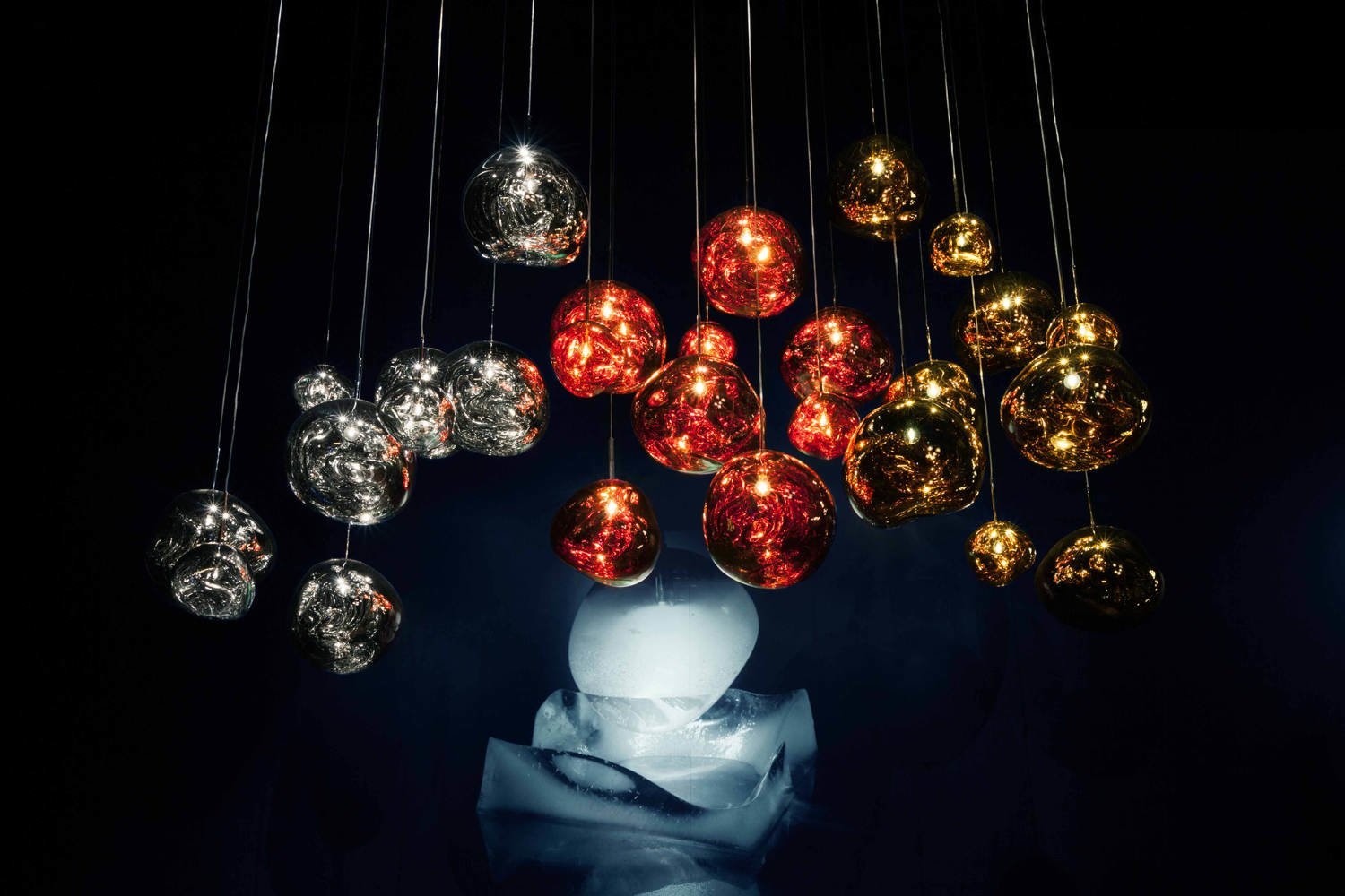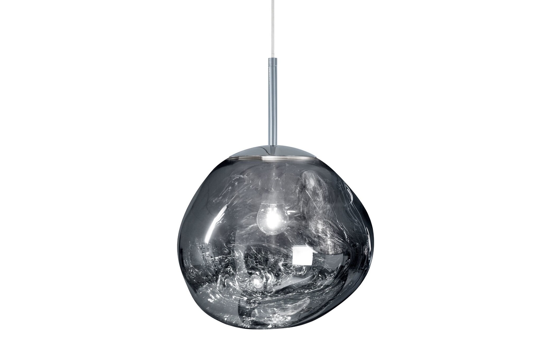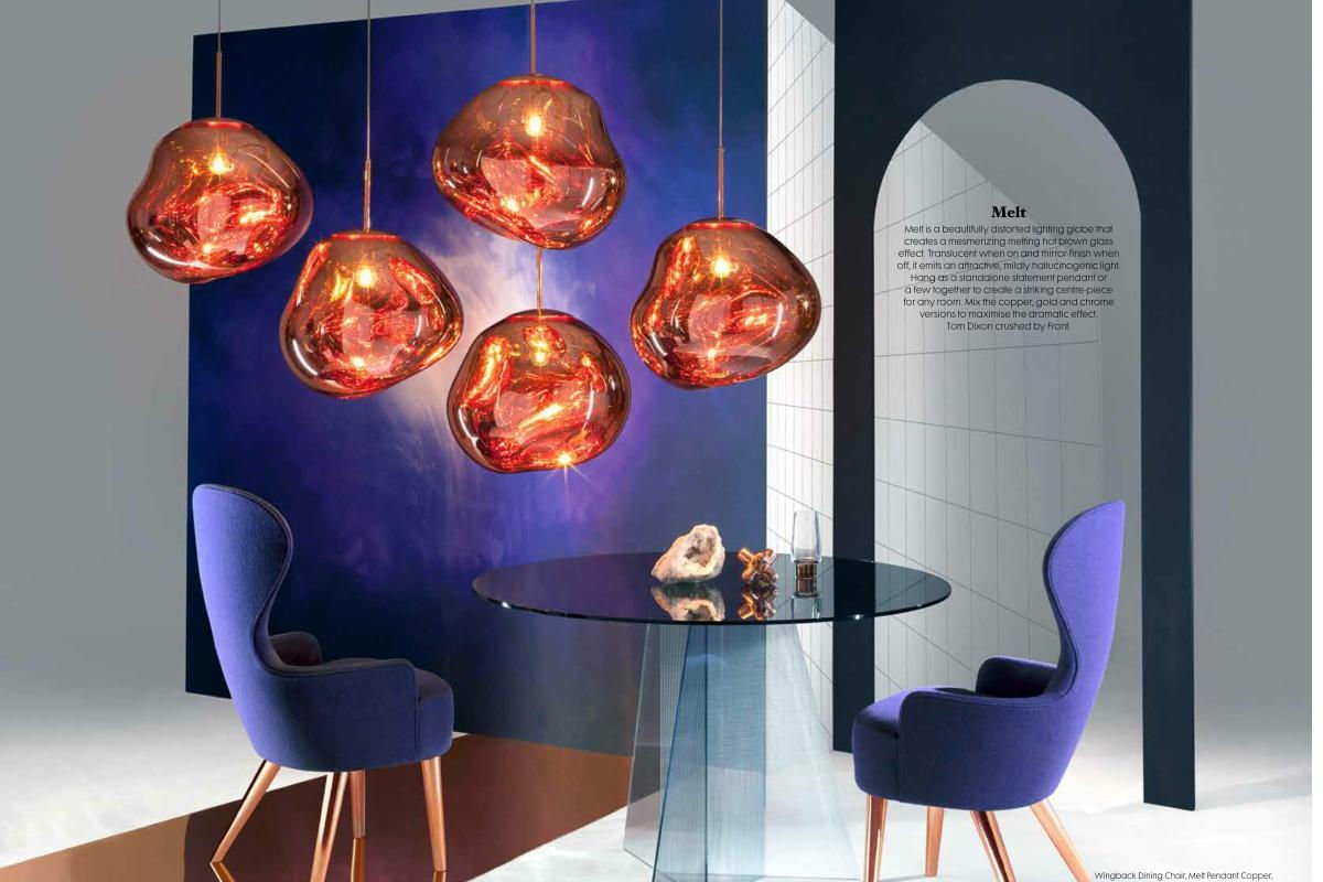 Doordat de Melt verkrijgbaar is in verschillende afmetingen en afwerkingen, zoals chroomkleurig, goudkleurig en bronskleurig kun je er eindeloos mee spelen door allerlei combinaties te maken, maar uiteraard kan de Tom Dixon Melt lamp alleen ook goed opgehangen worden.