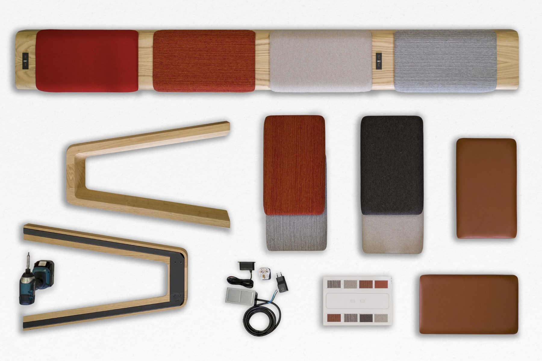 De zitting van de bank is te bekleden in stof, zoals wol, polyester (of zelfs gerecycled polyester) en leer.