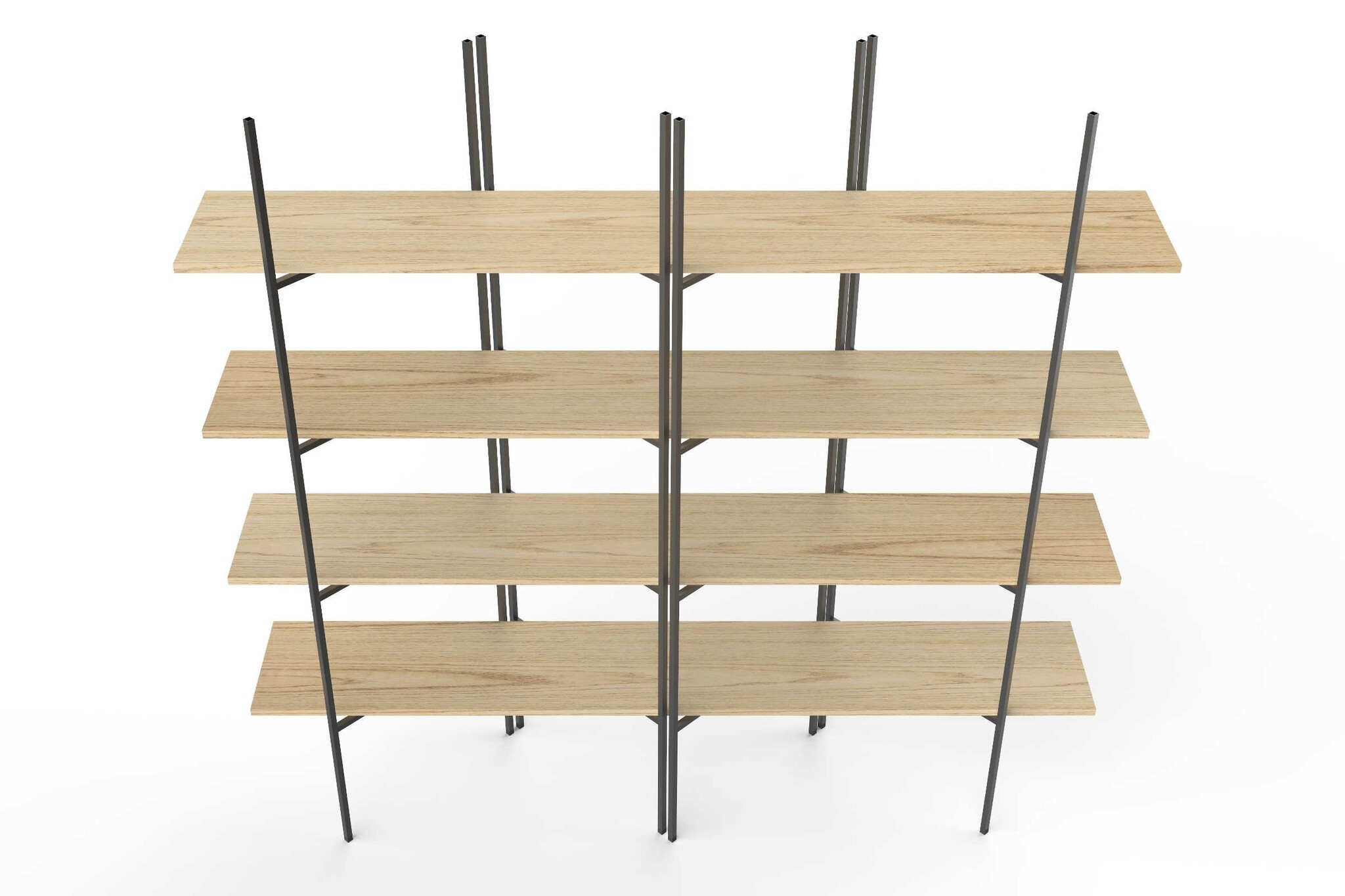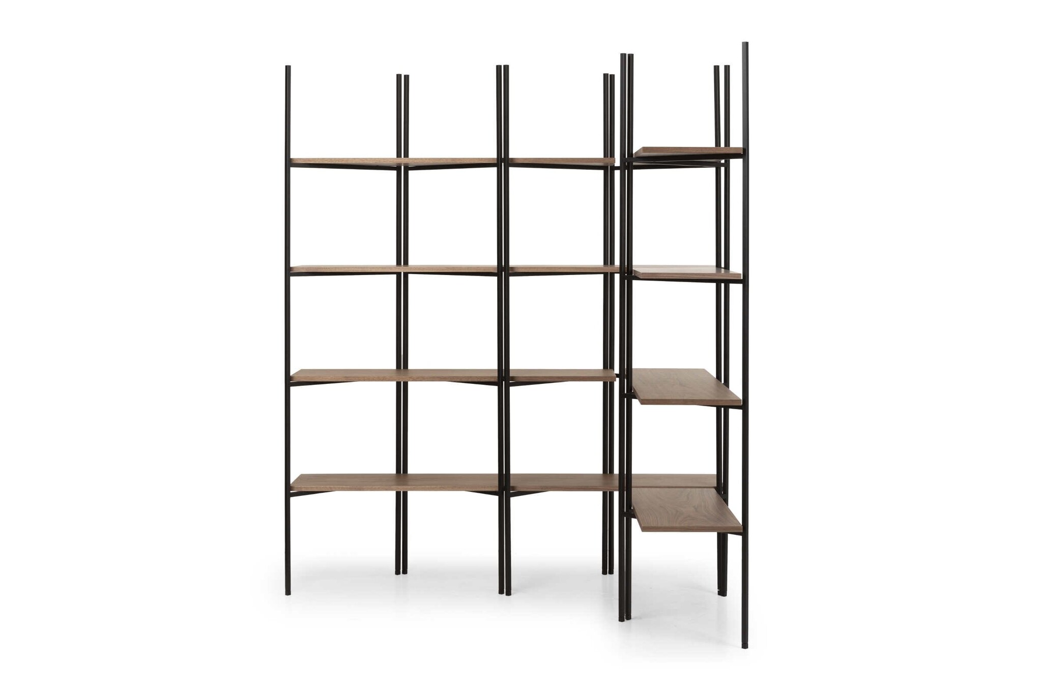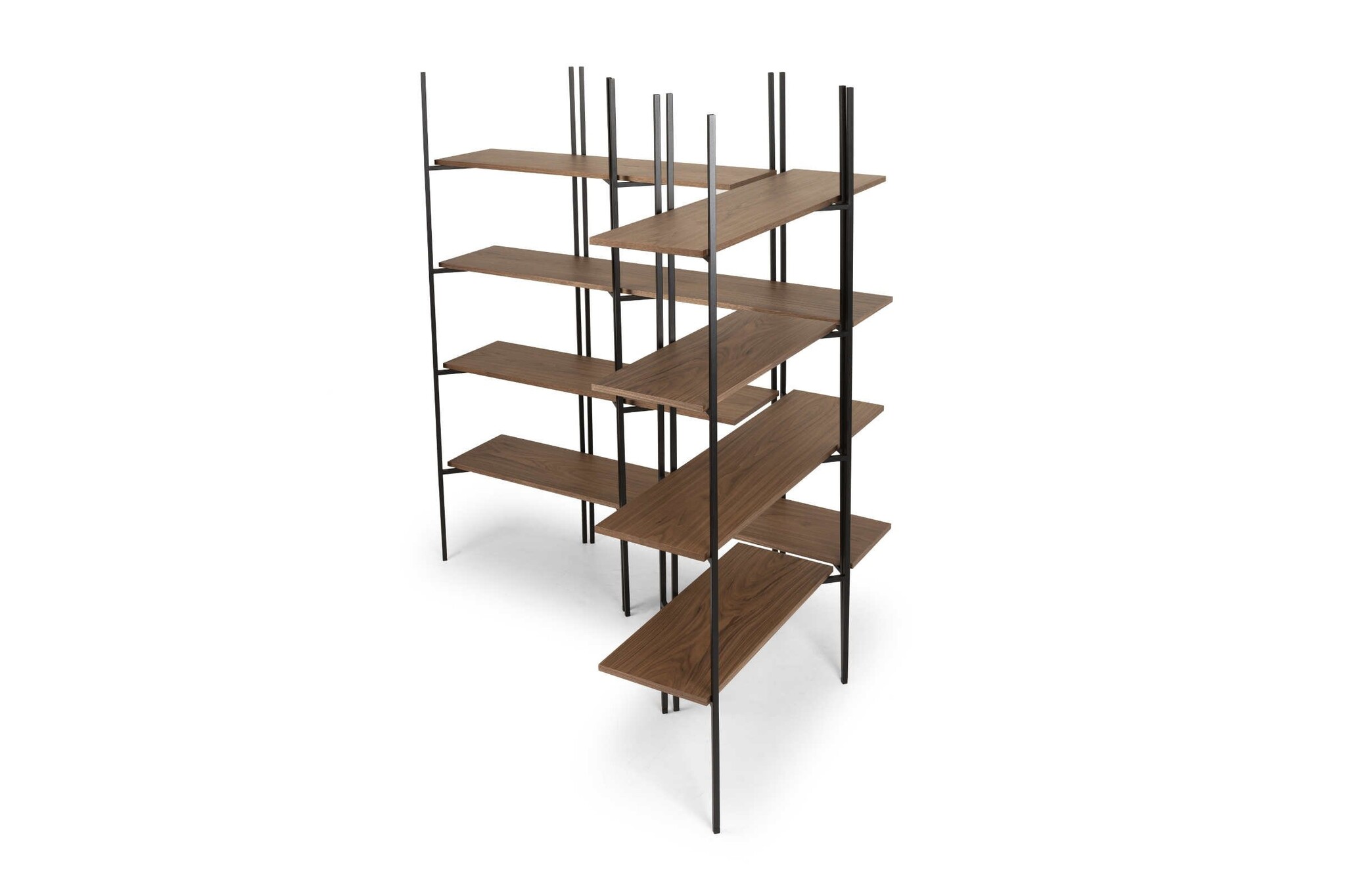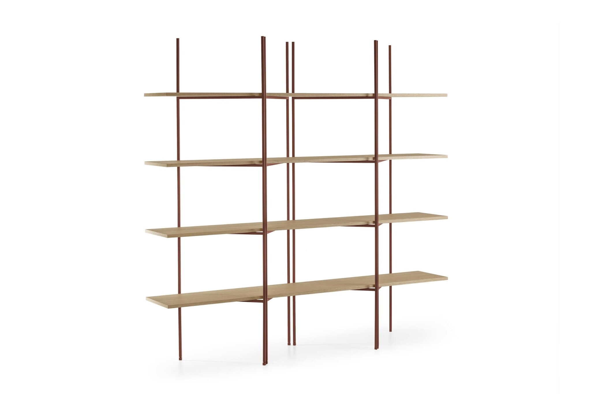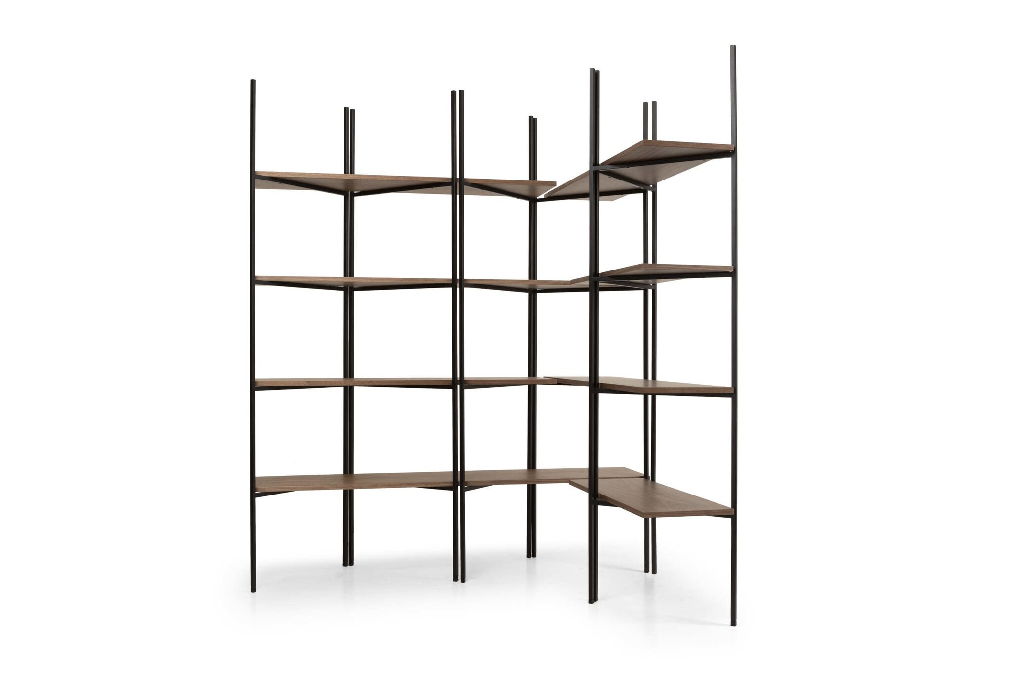 Met een eenvoudige verschuiving in de montage van de planken zijn er verschillende mogelijke configuraties beschikbaar, verschillend in vorm en afmetingen: lineair, op een hoek of kruisvormig. Het frame is gemaakt van glanzend staal, verkrijgbaar in vele kleuren en is te combineren met de mdf-planken die verkrijgbaar zijn met verschillende fineeropties.