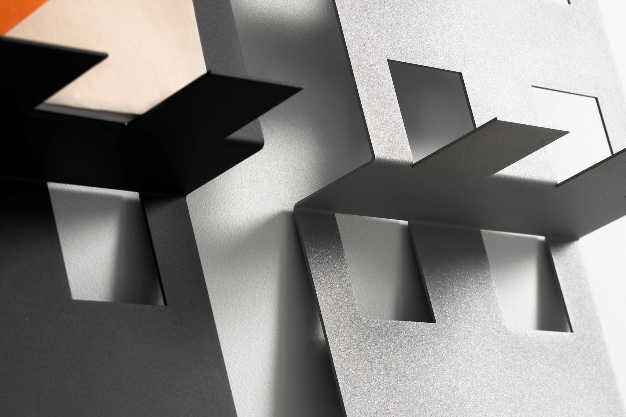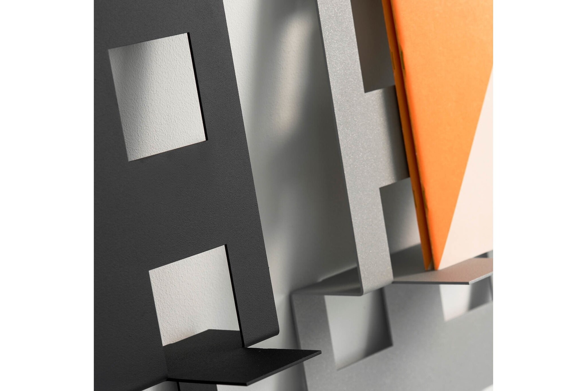 Het frame en de brochurehouders zijn leverbaar in zwart (van Esch 9311), metallicgrijs (van Esch 9306) of wit (van Esch 9310) structuurlak geëpoxeerd staal.