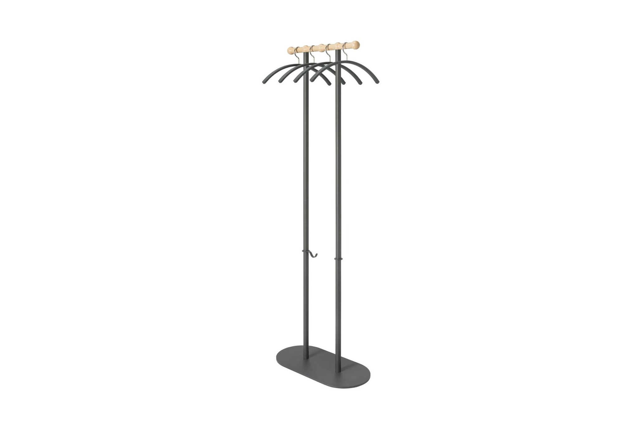 De Philippe van Van Esch is één van de praktische en elegante kapstokken uit de collectie. Ontwerper Christoph Seyferth heeft dit model fraai vormgegeven en heeft een sierlijke houder voor de kledinghangers ontworpen. Deze houten houder met ingefreesde groeven houdt de kledinghangers op afstand van elkaar. Kledinghangers (Tubulus 100) worden standaard bijgeleverd. Ook heeft de Philippe een extra haakje, hier kunnen sleutels, een handtas of andere benodigdheden gemakkelijk opgehangen worden. Dit model is staande kapstok welke 4 kledinghangers en twee extra haakjes bezit. Een gestroomlijnd model. De voet, kolom, ring en haak zijn in donkergrijs of wit verkrijgbaar, afgewerkt met structuurlak en gemaakt van geëpoxeerd staal. Het bovendeel is gemaakt van naturel essen, wat gelakt is.