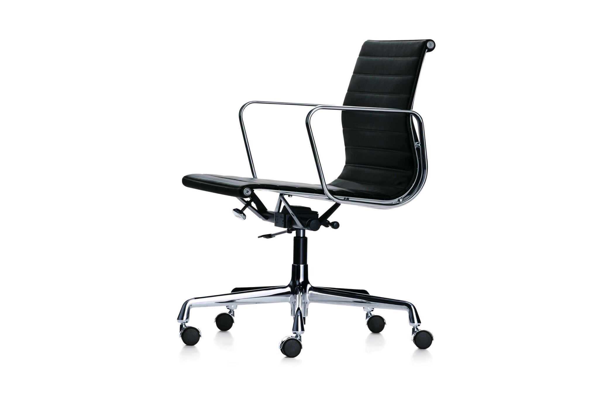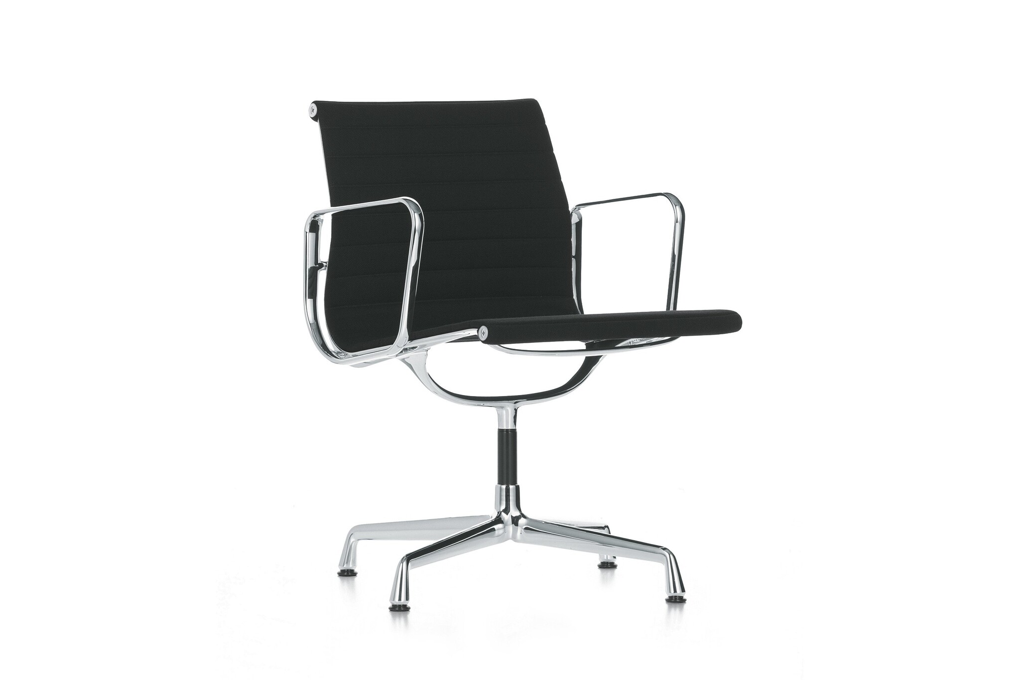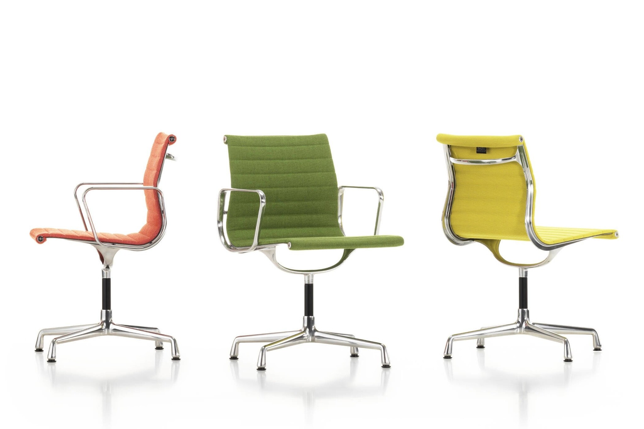 Vitra Aluminium Group stoelen en fauteuils met middelhoge en hoge rugleuning, met of zonder armleuningen, naar keuze met lederen opleggers. Zijprofielen, spanbeugel, armleuningen en onderstel van drukgietaluminium, gepolijst of verchroomd. Bekleding hoogfrequent gelast, overtrek Hopsak (100% polyamide), netweefsel (met kunststof ommanteld polyestergaren) of nappa rundleder.Onderstelvarianten: viersteronderstel, draaibaar of niet draaibaar, met glijders voor zachte of harde vloeren.