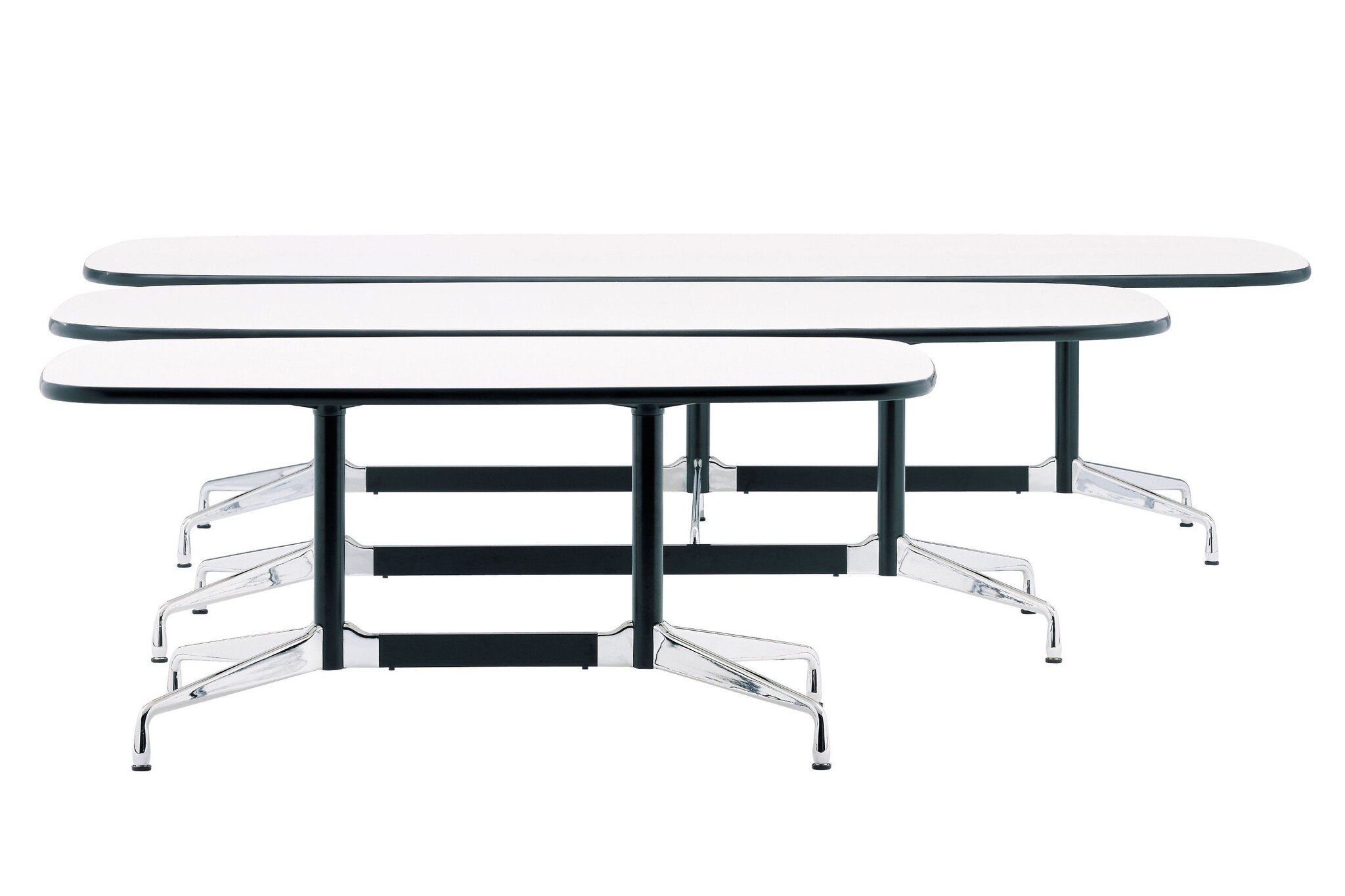 De Vitra Eames Segmented Tables zijn er in verschillende bladvormen, afmetingen en configuraties. Hierdoor heeft u een brede keuze in tafels voor uw vergaderruimte, boardroom, bedrijfsrestaurant of in de algemene bedrijfsruimte om als aanlandplek te gebruiken. Tot de Eames Tables collecties behoren de Segmented Tables (grote klassieke tafelconfiguraties) en de Contract Tables (bespreektafels in verschillende maten). Volledig opgeladen vergaderen