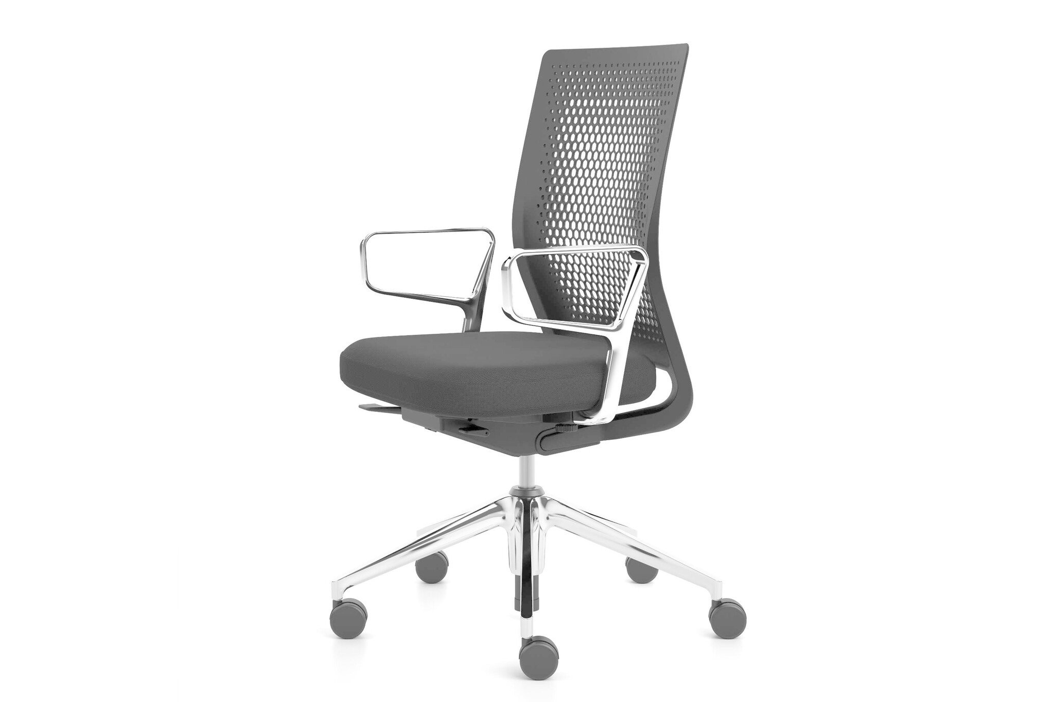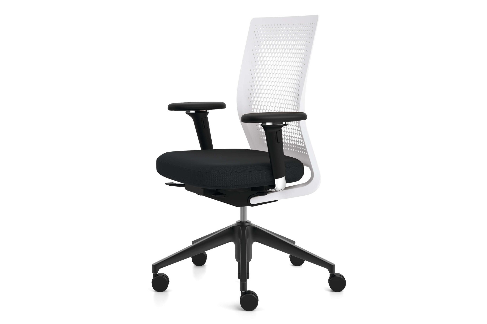 De Vitra ID Air bureaustoel heeft een eenvoudige constructie, maar biedt optimaal zitcomfort. De stoel heeft een flexibele rugleuning van kunststof met een gaatjespatroon. Vandaar de naam Air. De rugleuning is onderhoudsvriendelijk en garandeert een aangename luchtcirculatie. Deze bureaustoel is ideaal toe te passen in kantoren voor langdurige werkzaamheden aan een bureau. Hij biedt namelijk langdurig ondersteuning voor een gezonde zithouding en voorkomt hiermee lichamelijke klachten. Vitra ID Air met Clima Seat