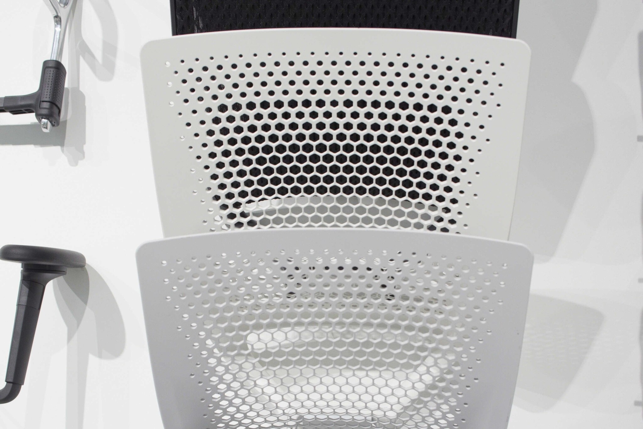 De kunststof rugleuning van opengewerkt polypropyleen is leverbaar in basic dark, soft grey of soft light.